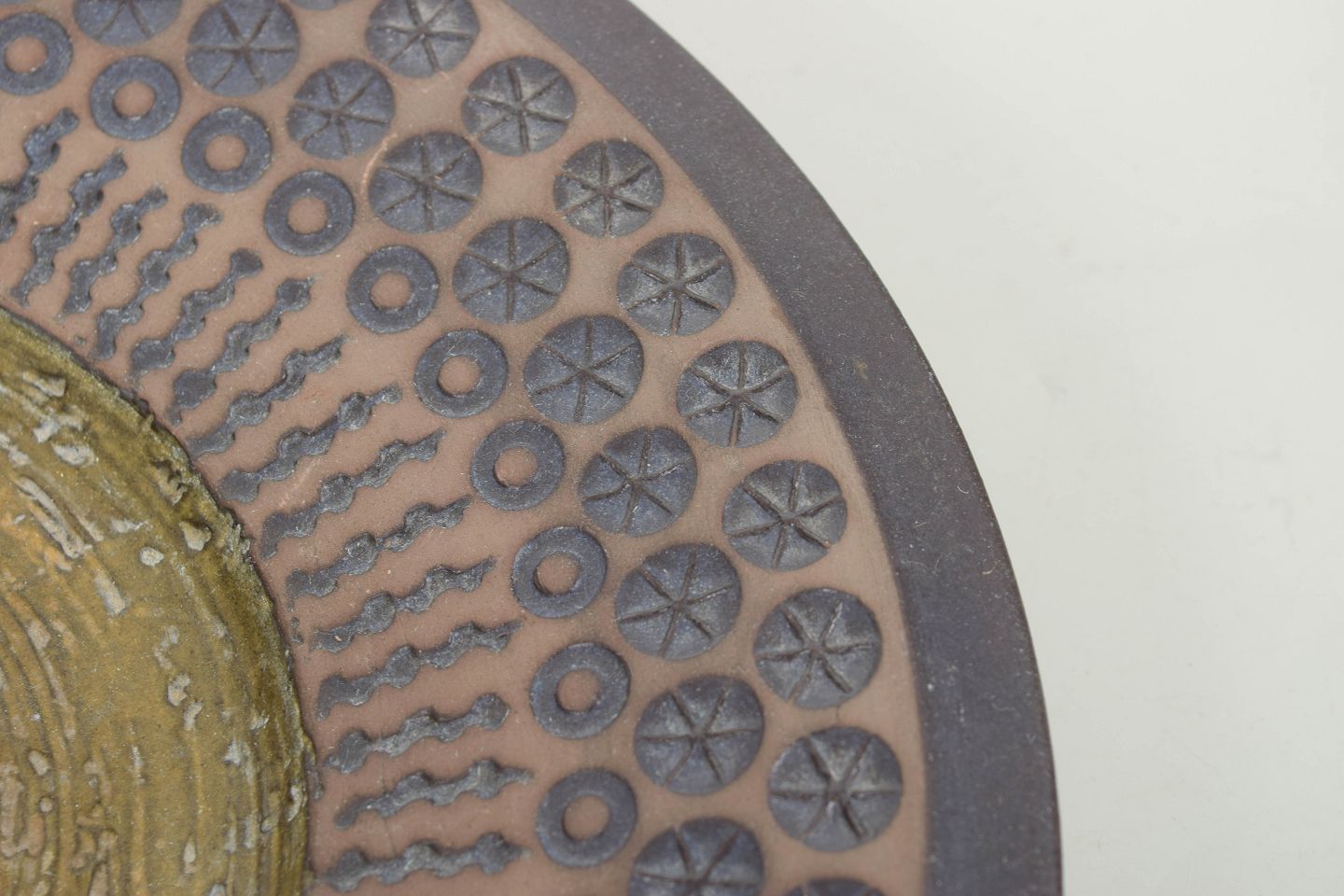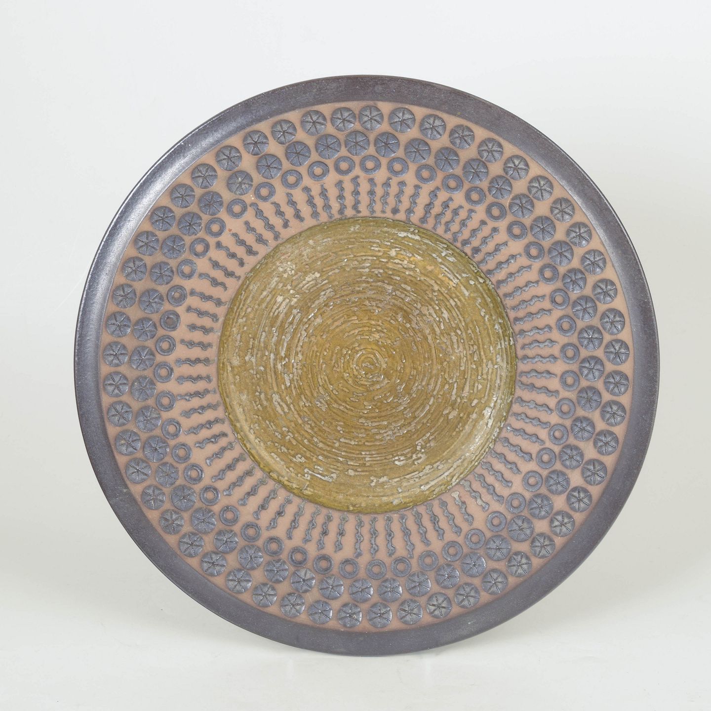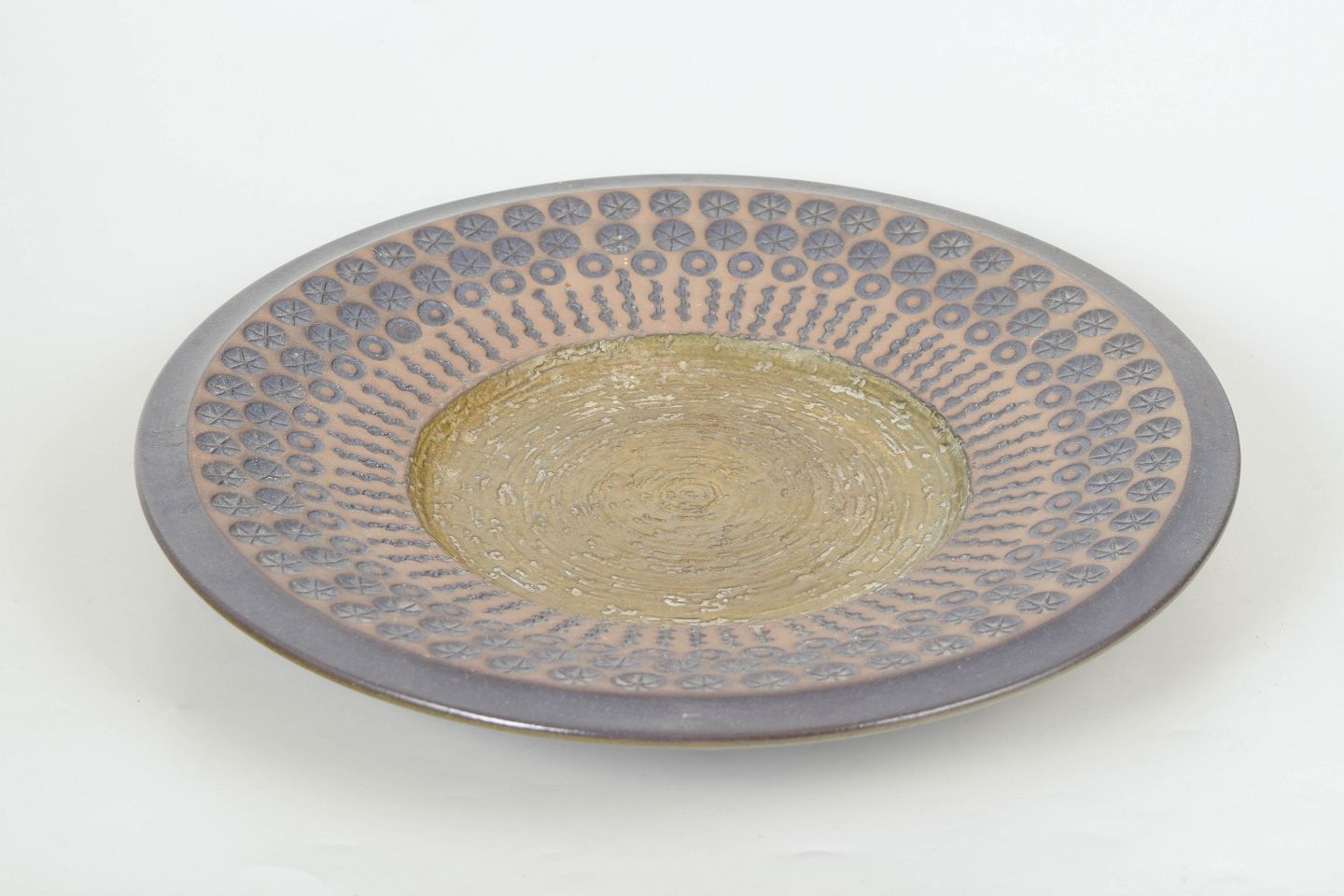 Stort rundt keramikfad model 6071M med geometrisk reliefdekoration i koncentriske mønstre og håndglaserede jordfarver i rosa, grå og olivengrønne nuancer.