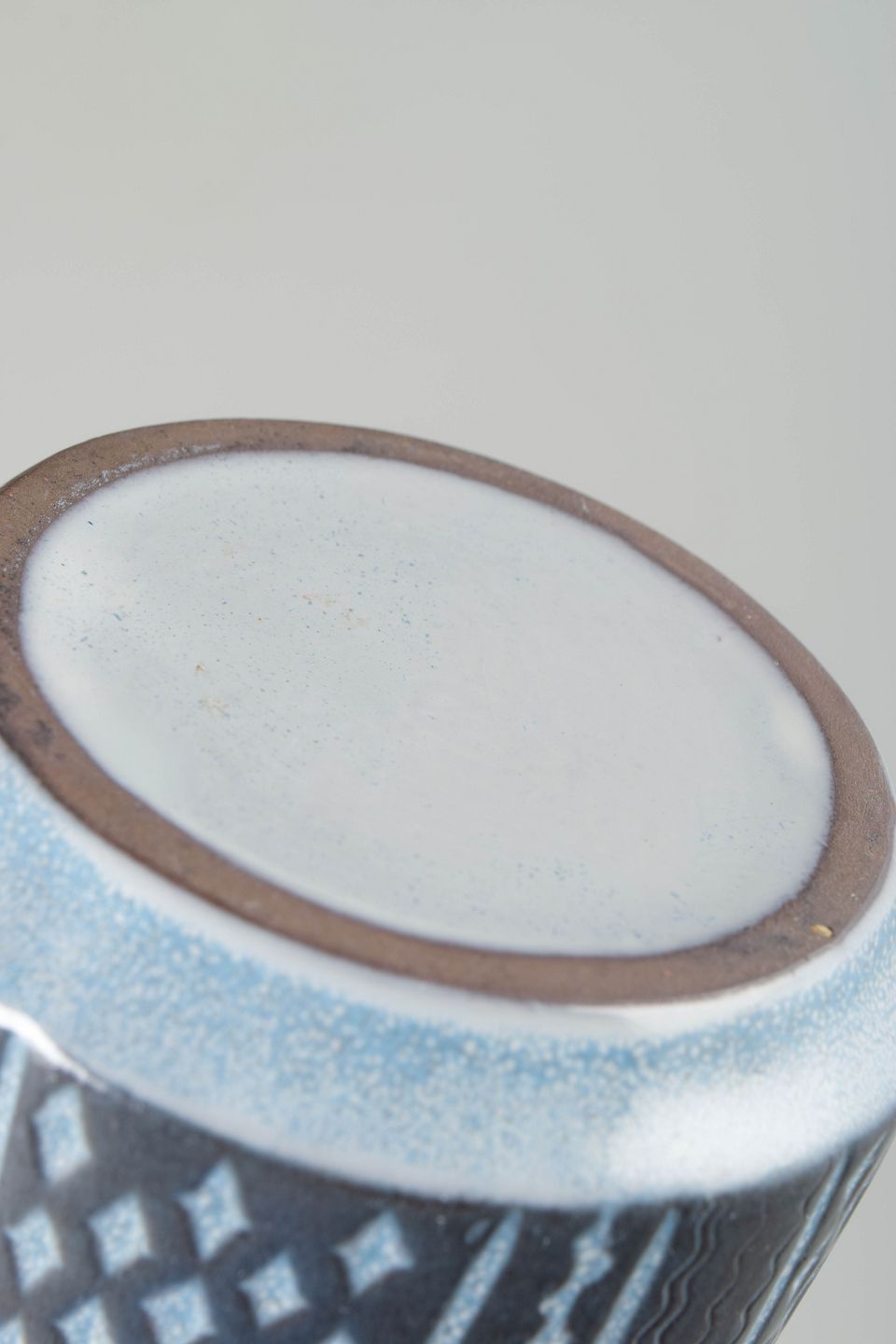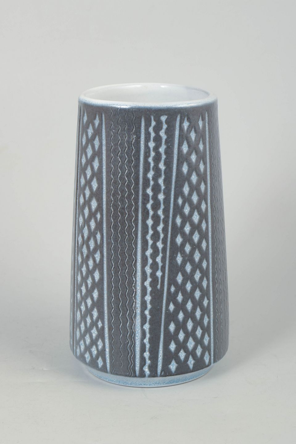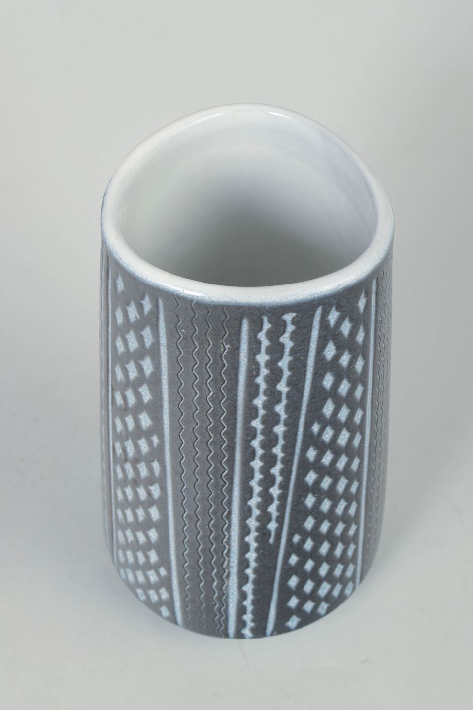 Cylindrisk keramikvase med grafisk dekoration i vertikale mønstre og glaserede nuancer i gråblå og hvid.