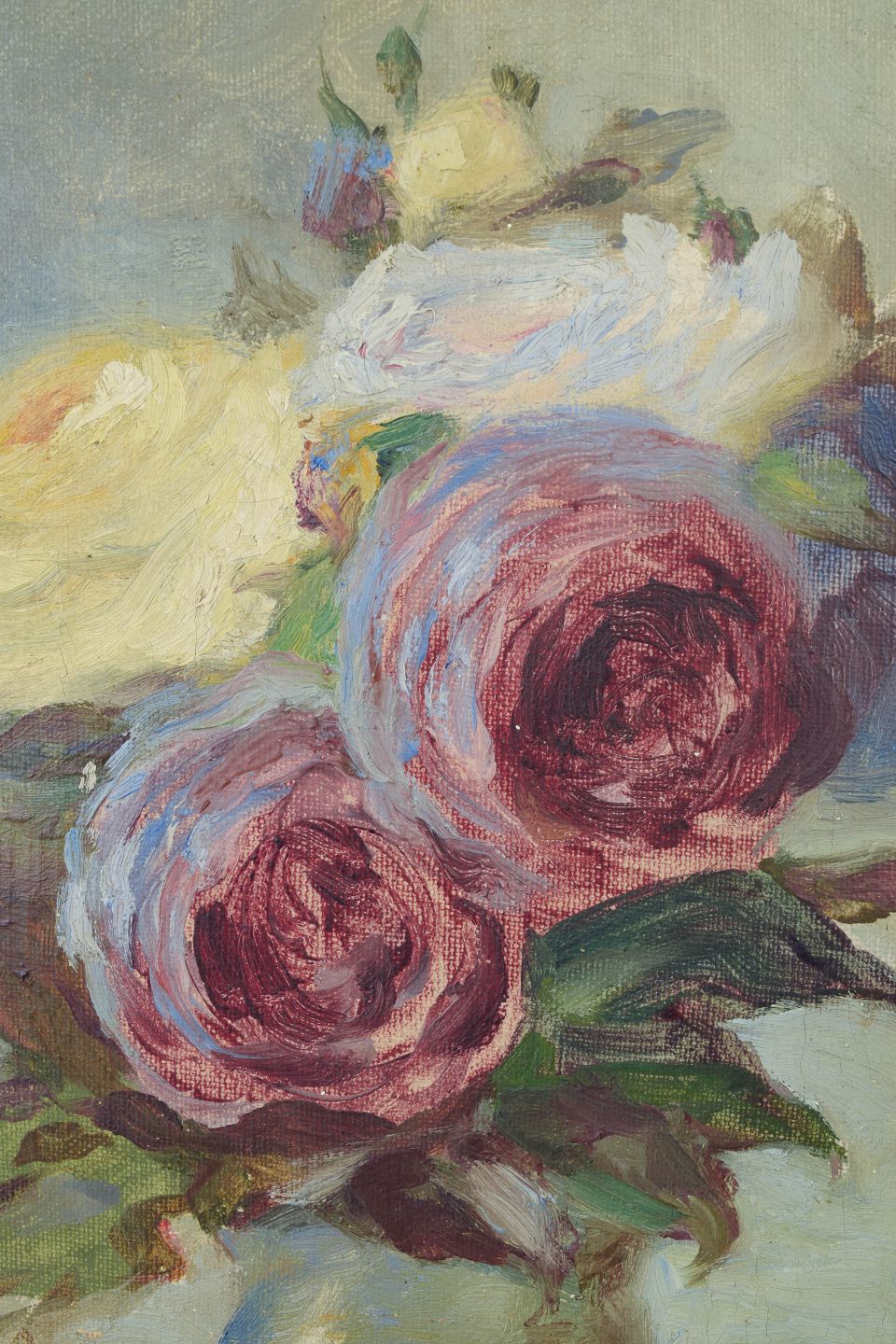 Delikat blomsterstilleben med roser udført i olie på lærred, signeret og dateret 1917, med blød koloristisk penselføring og klassisk sen-impressionistisk atmosfære.
