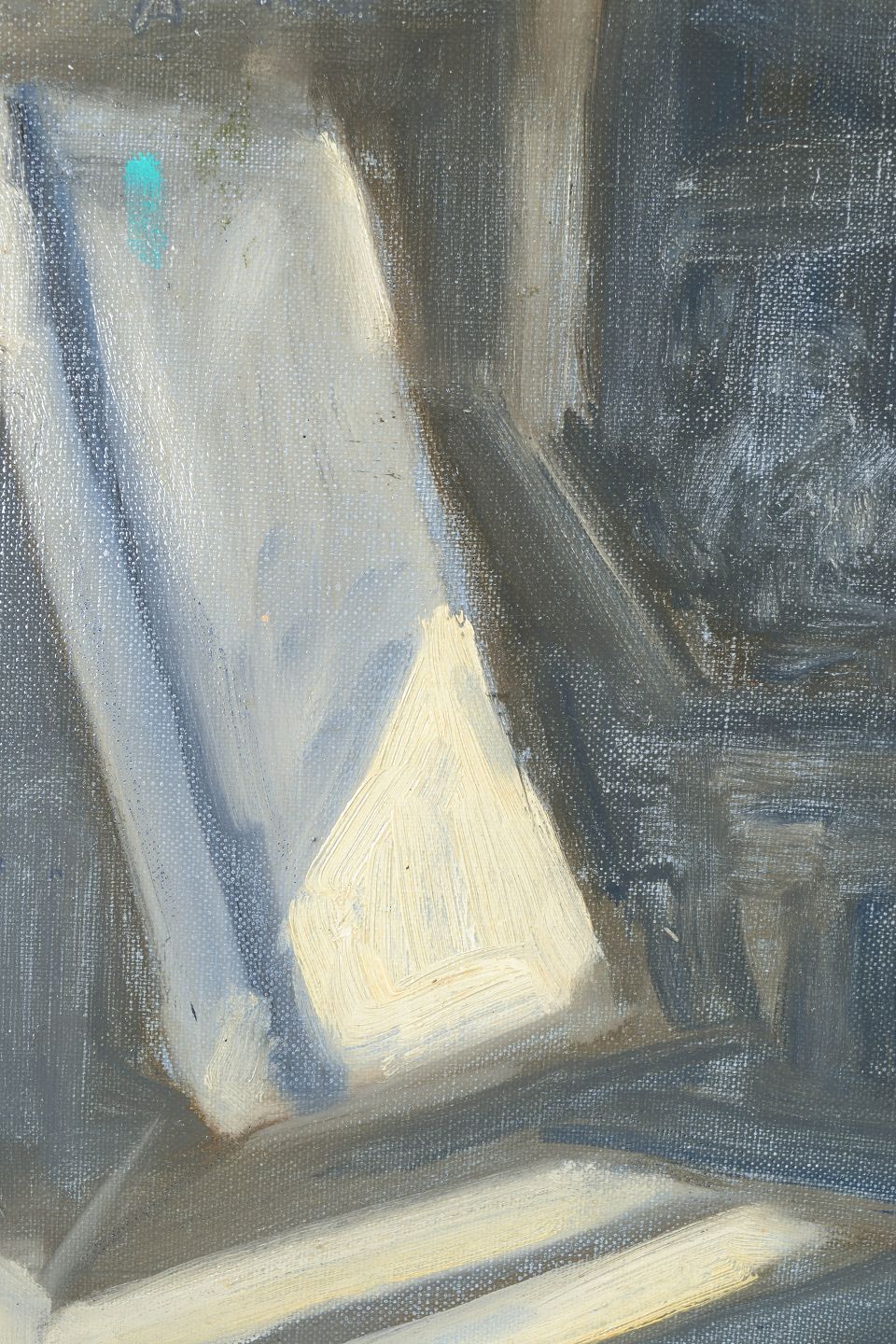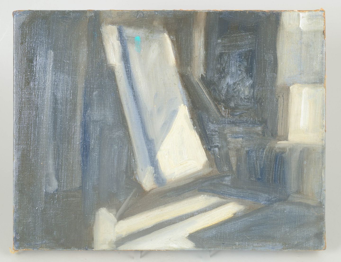 Abstrakt modernistisk komposition udført i dæmpede grå, blå og lyse toner med geometriske og arkitektoniske former. Usigneret værk med raffineret kompositorisk balance og tydelig inspiration fra efterkrigstidens franske abstraktion.