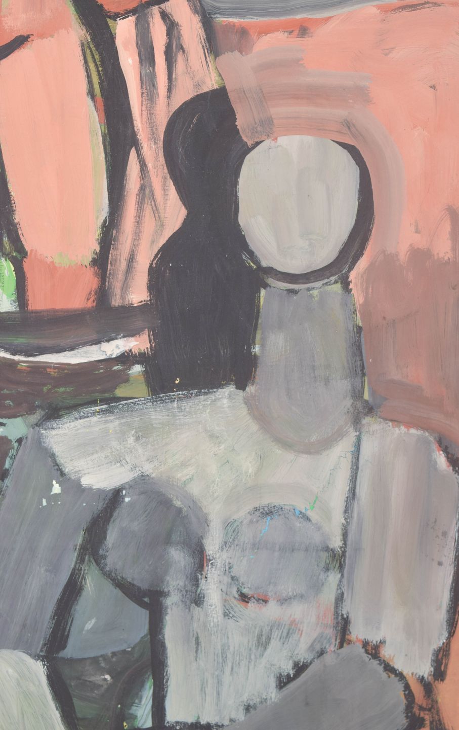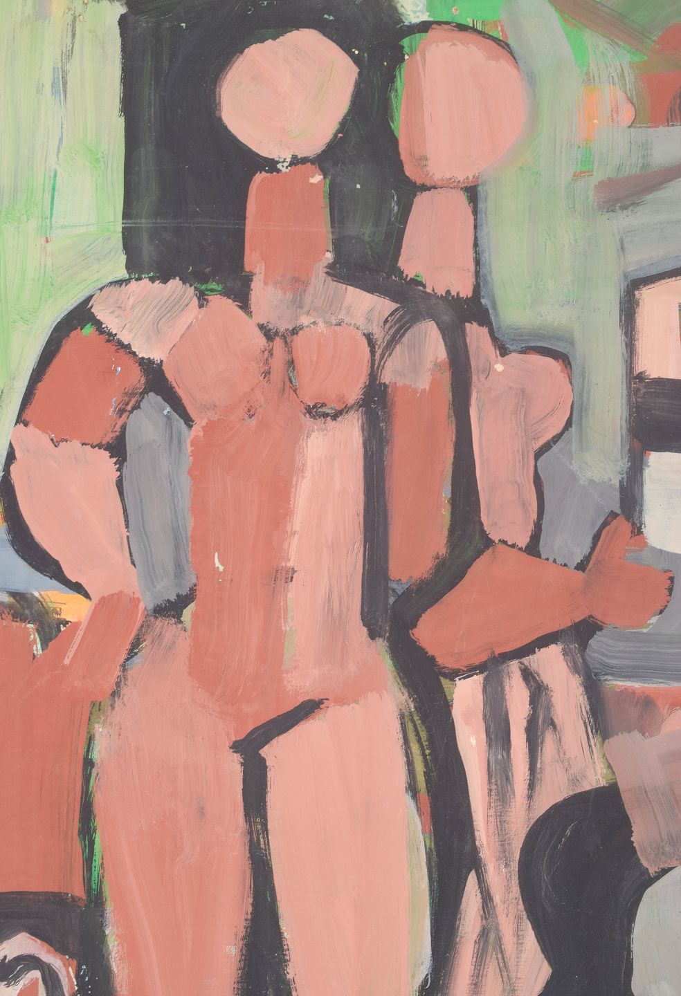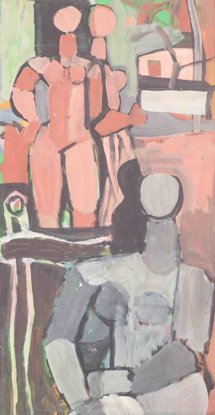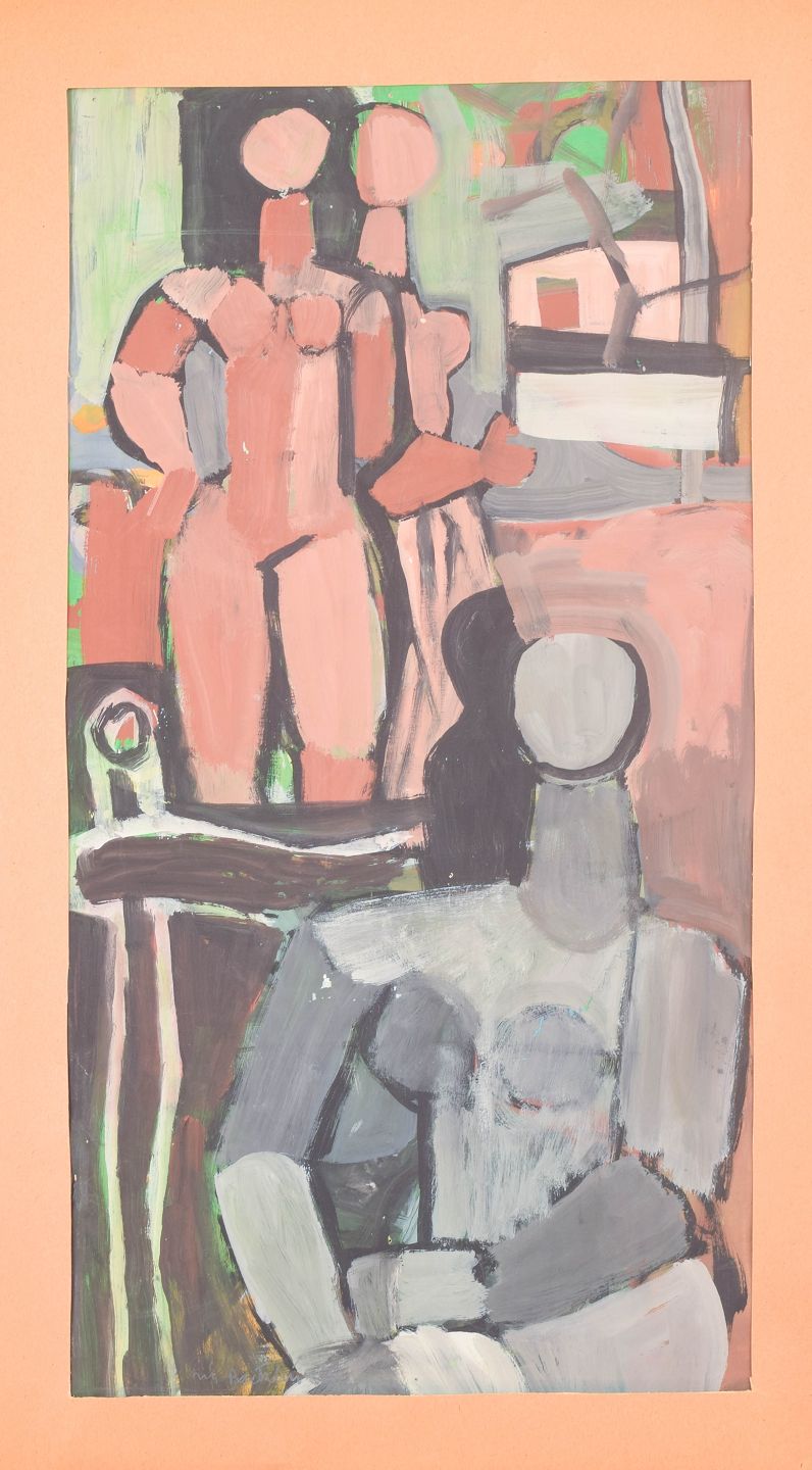 Modernistisk figurativ komposition med abstraherede menneskefigurer og interiørelementer udført i ekspressiv farveholdning, malet i olie på papir.