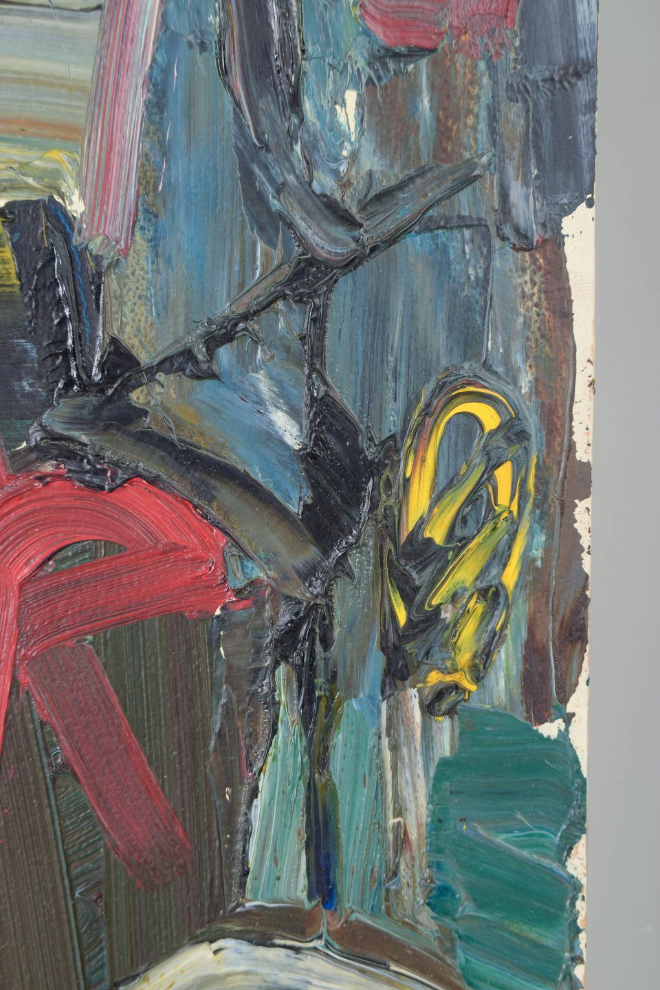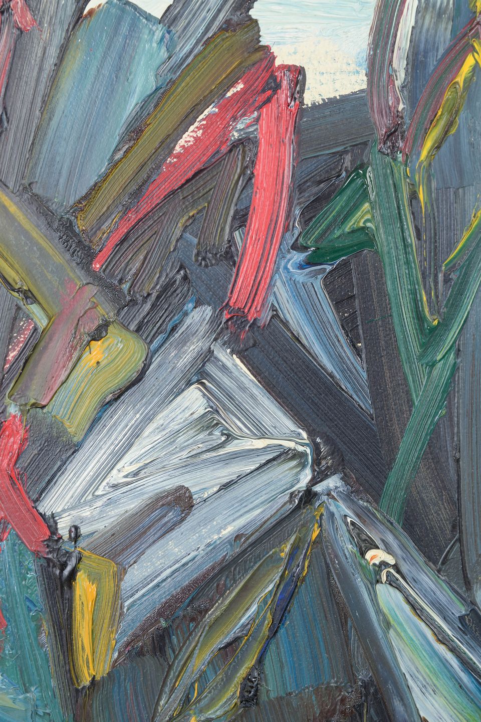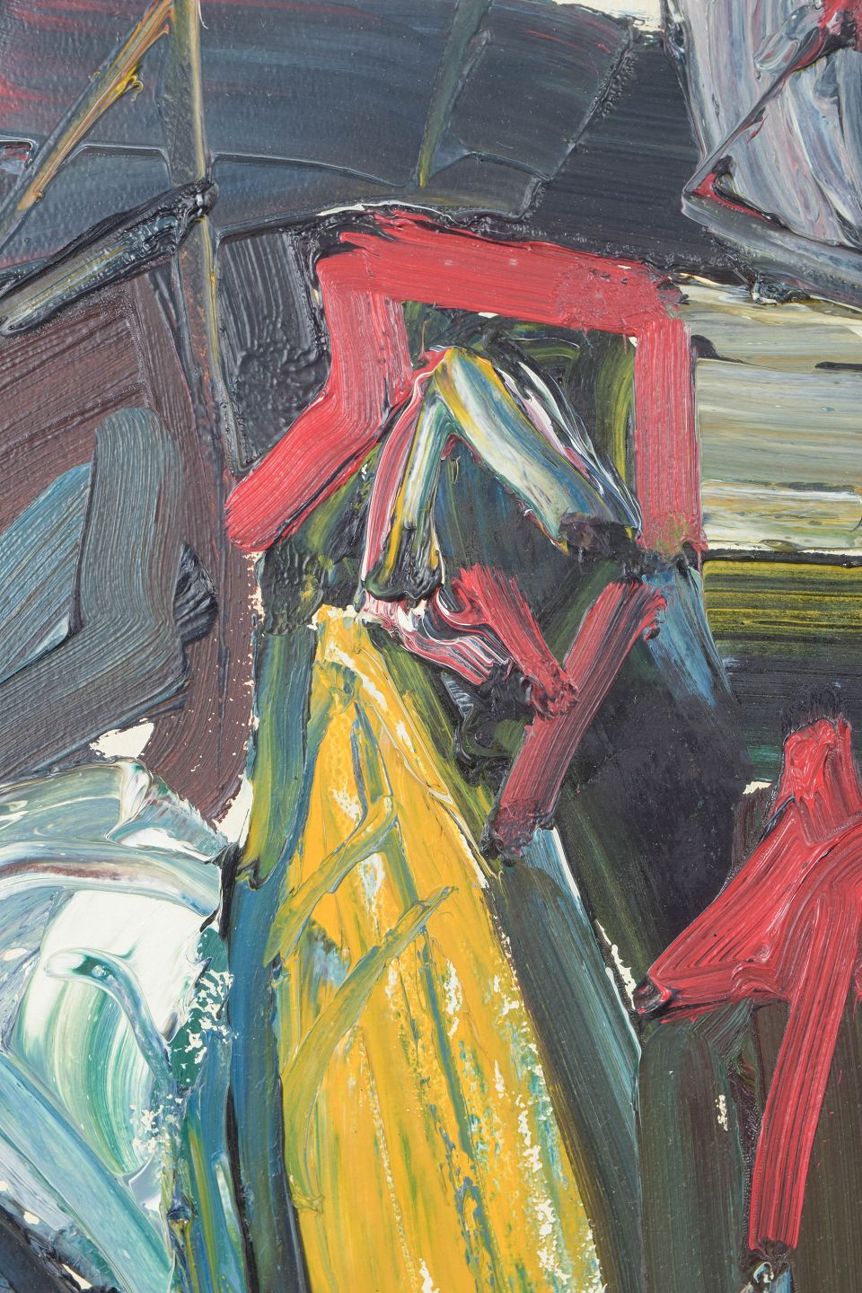 Ekspressiv abstrakt komposition udført med pastose penselstrøg og kraftfuld kolorisme, hvor modernistiske former og spontan gestik skaber et dynamisk billedsprog.
