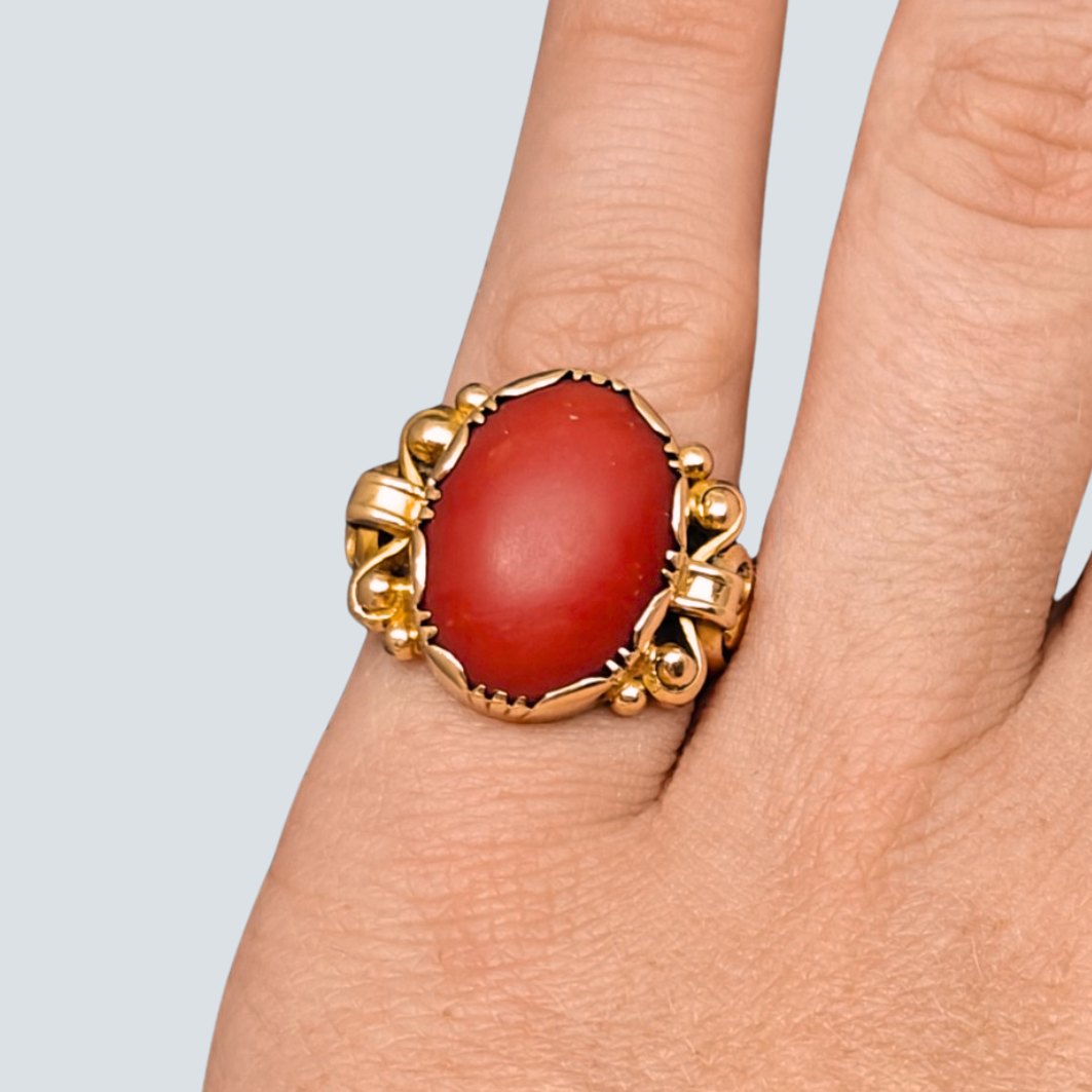 A ring in 14k gold from around 1920. Set with a coral. Ring size 49. Coral measurements: 1,7 x 1,2 cm. Stamped "585" Please contact us if you're looking for anything specific. What you see on our webside is just a small selection.