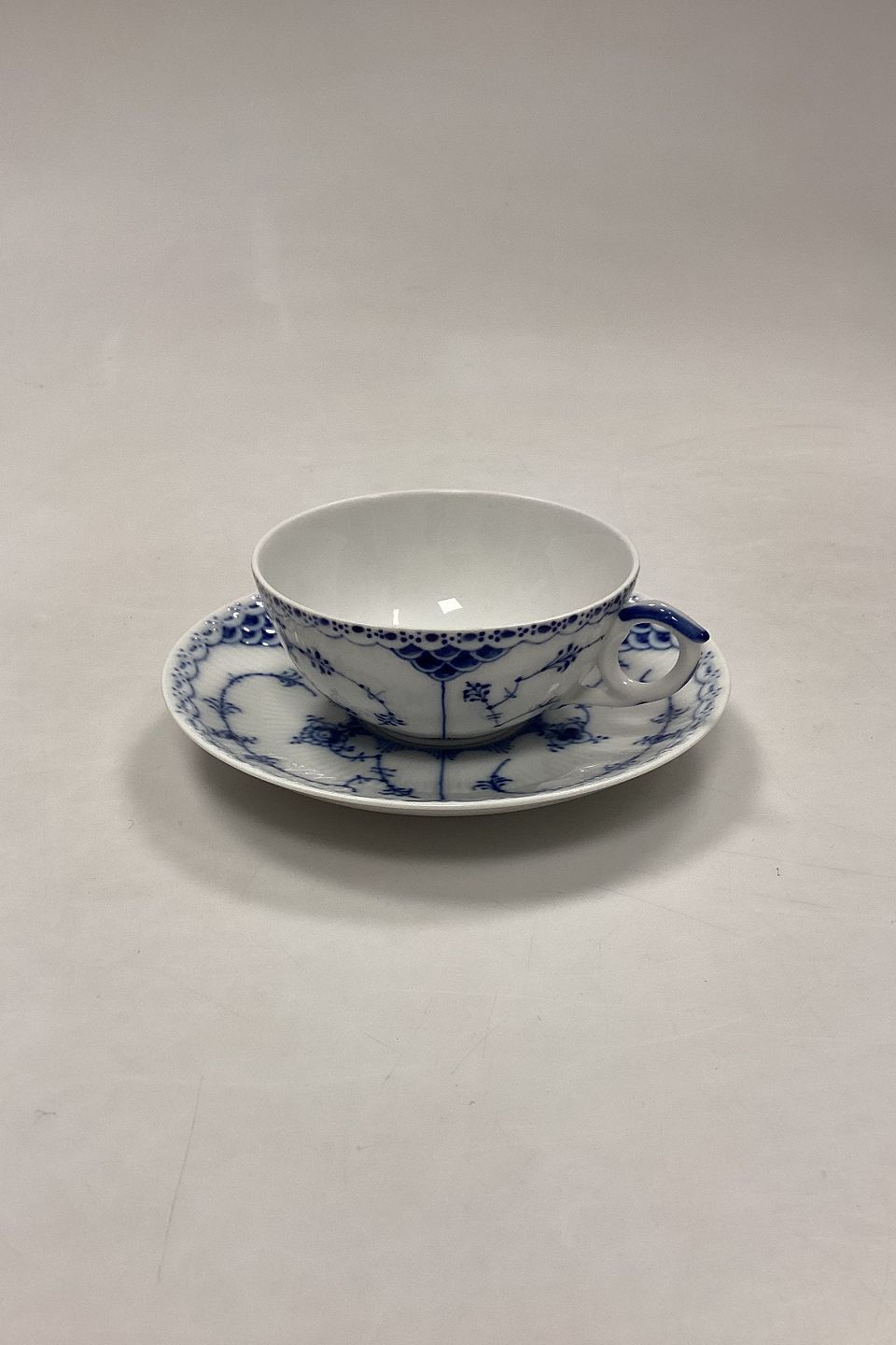 Royal Copenhagen Blue Fluted Half Lace Tea Cup and Saucer No. 525. Cup measures 4,5 x 10 cm / 1.77 in. x 3.93 in. 1st Quality