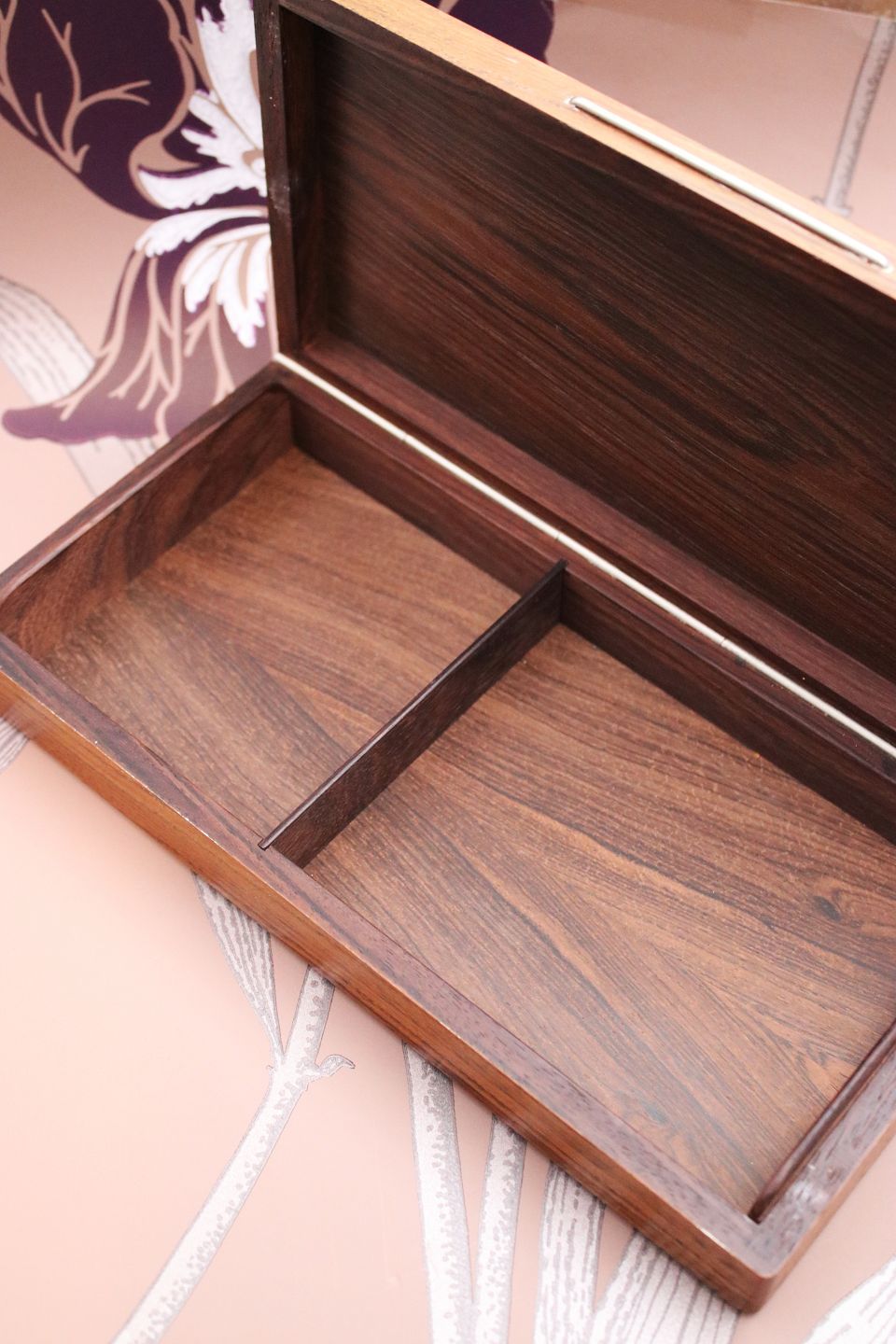 Aflang æske i palisander dekoreret med sølv indlægning med motiv af lille elefant som bære en træstamme...