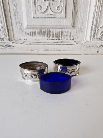 Par ovale saltkar i sølv med dekoration i skønvirkestil med indsatser i blåt glas. Stemplet de tre tårne 1909 Mål 4 x 6 cm. Højde 3 cm.