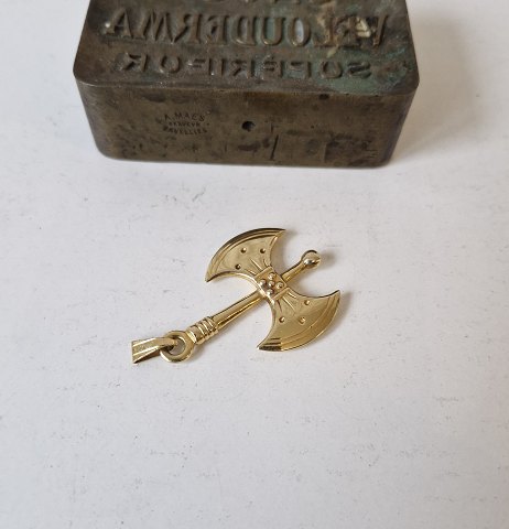 Græsk vedhæng i 14kt guld, udført som dobbeltøkse - Labrys. Øksen kendes fra Kreta - Knossos. Stemplet 585 Vægt 4,7 gram. Længde 5 cm. Bredde 3 cm.