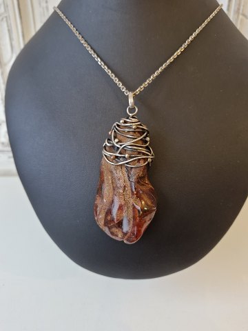 Silver necklace with large amber pendant wrapped with silver thread. Stamped 925. Dimensions of the amber lump 4 x 8 cm. Length of the necklace 60 cm. Width 2 mm.