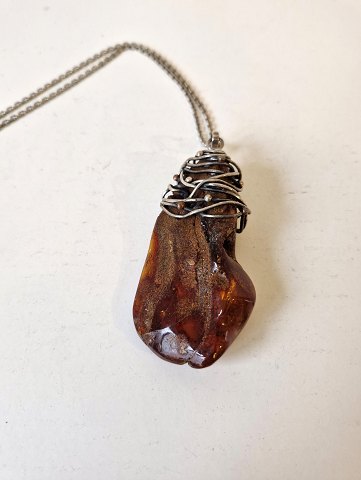 Sølv halskæde med stort ravvedhæng omviklet med sølv tråd Stemplet 925 Mål på ravklumpen 4 x 8 cm. Længde på halskæden 60 cm. Bredde 2 mm.