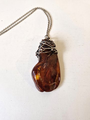 Silver necklace with large amber pendant wrapped with silver thread. Stamped 925. Dimensions of the amber lump 4 x 8 cm. Length of the necklace 60 cm. Width 2 mm.