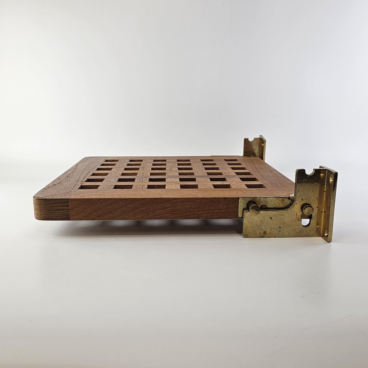 Klapsæde i teak træ med messing beslag til vægmontering fra serien Nautic