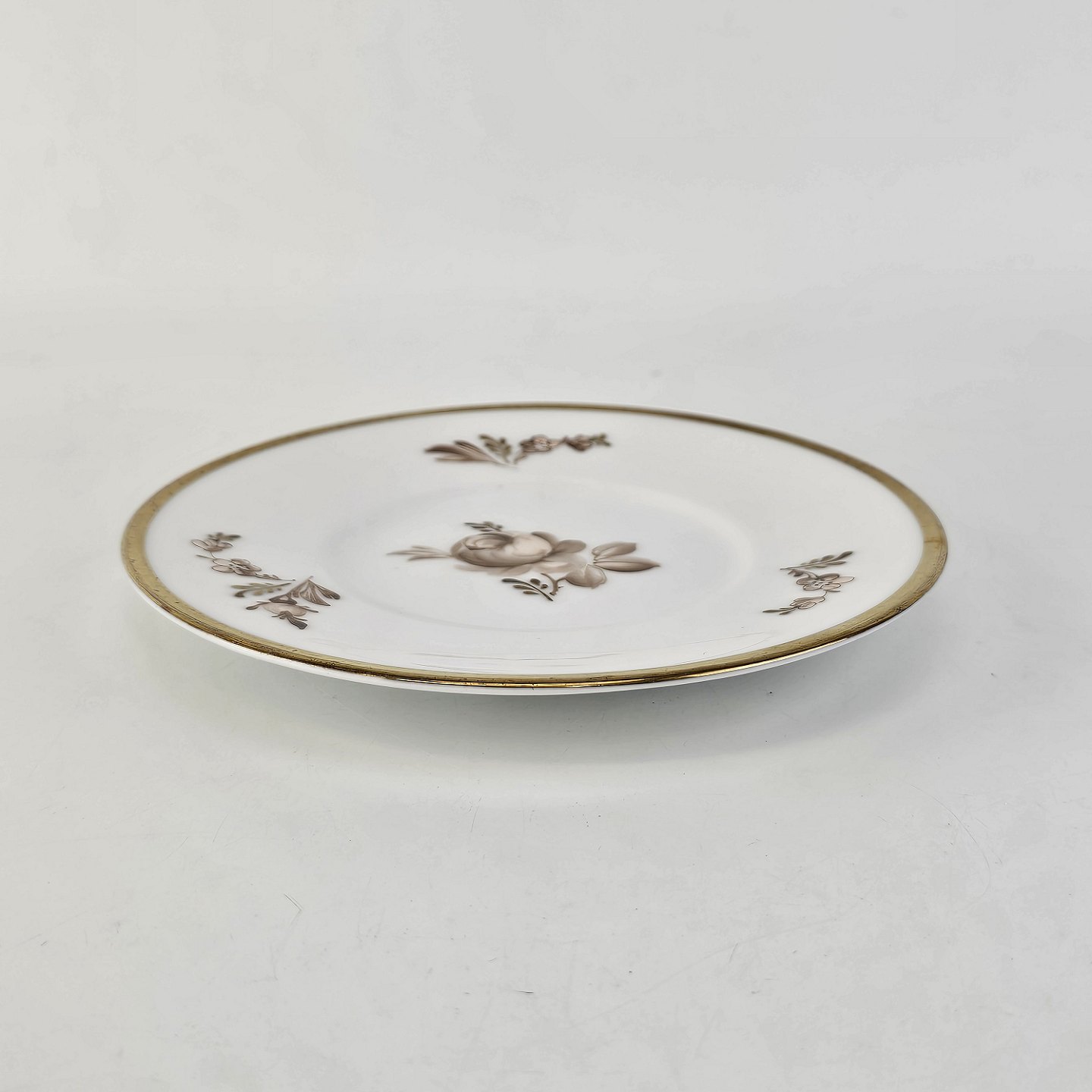 Stel i glat hvidt porcelæn dekoreret med brune roser og guldbort