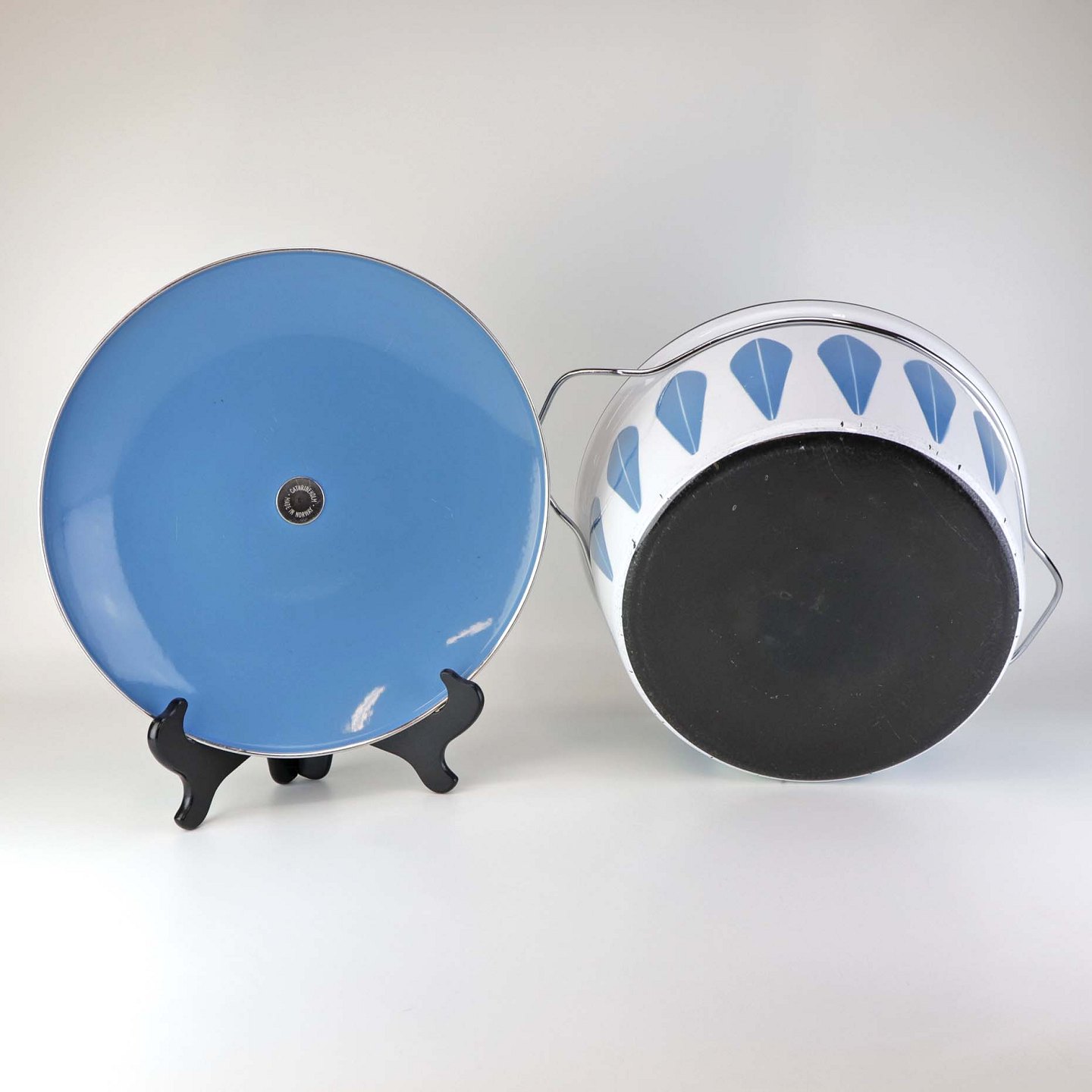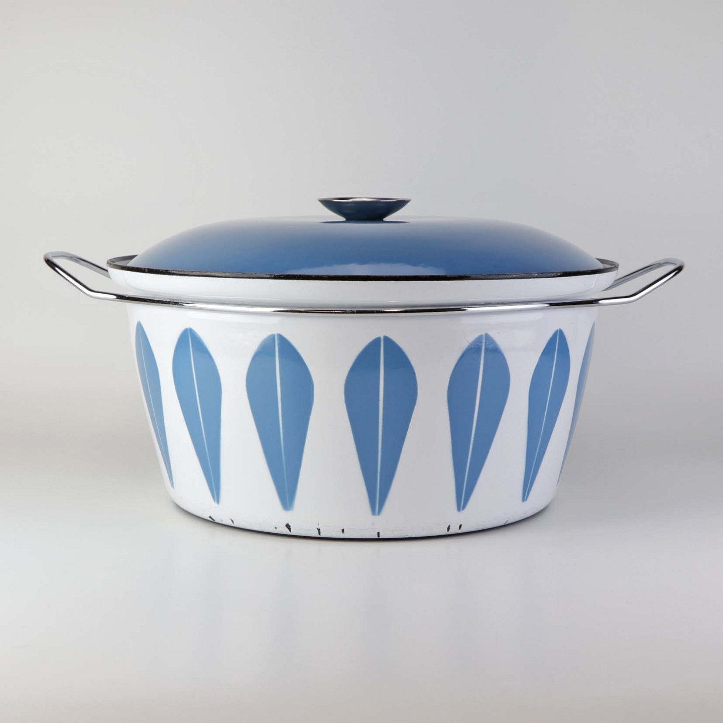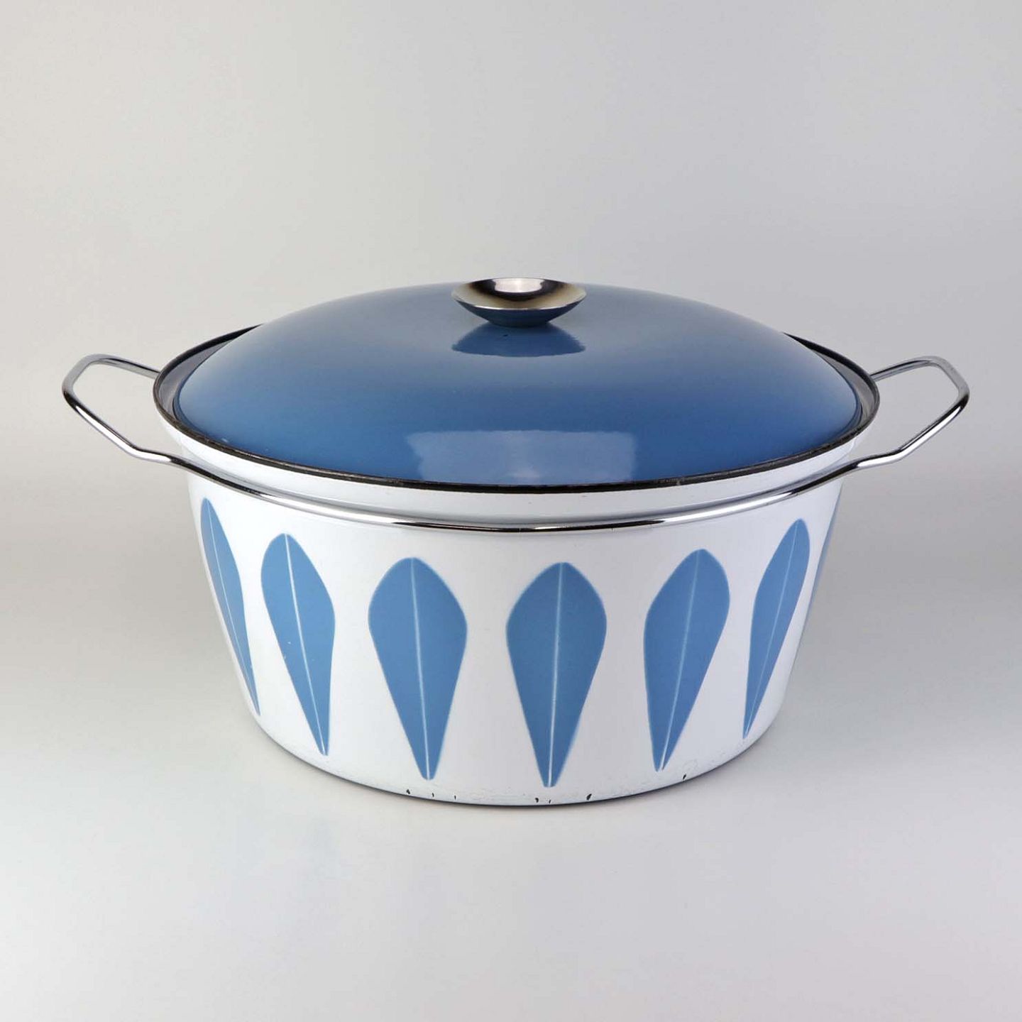 Stor emalje gryde med låg og med blå Lotus motiv. Gryden er fra 1960'erne.