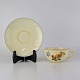 Stel i glat gul fajance med dekoration af farverige og forskelligartede blomster samt med gul og sort kantstreg.