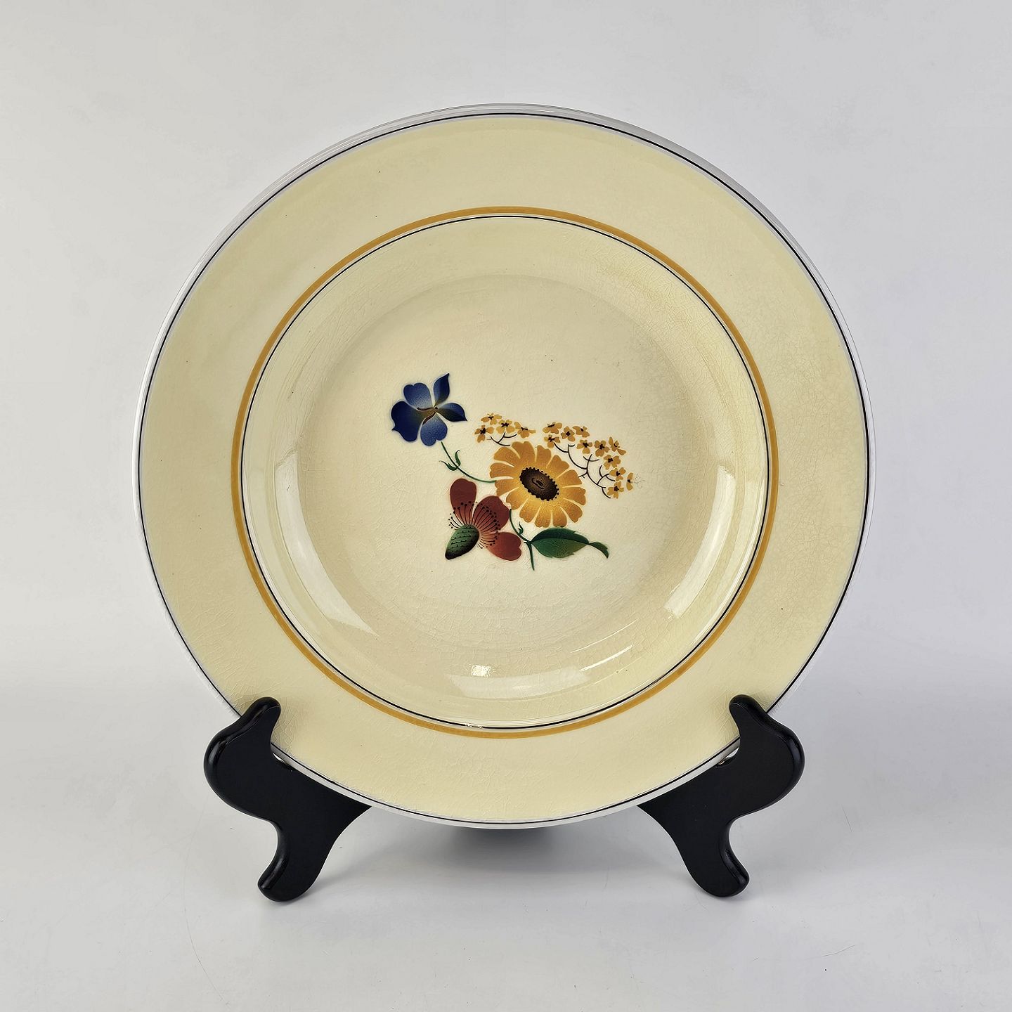Stel i glat gul fajance med dekoration af farverige og forskelligartede blomster