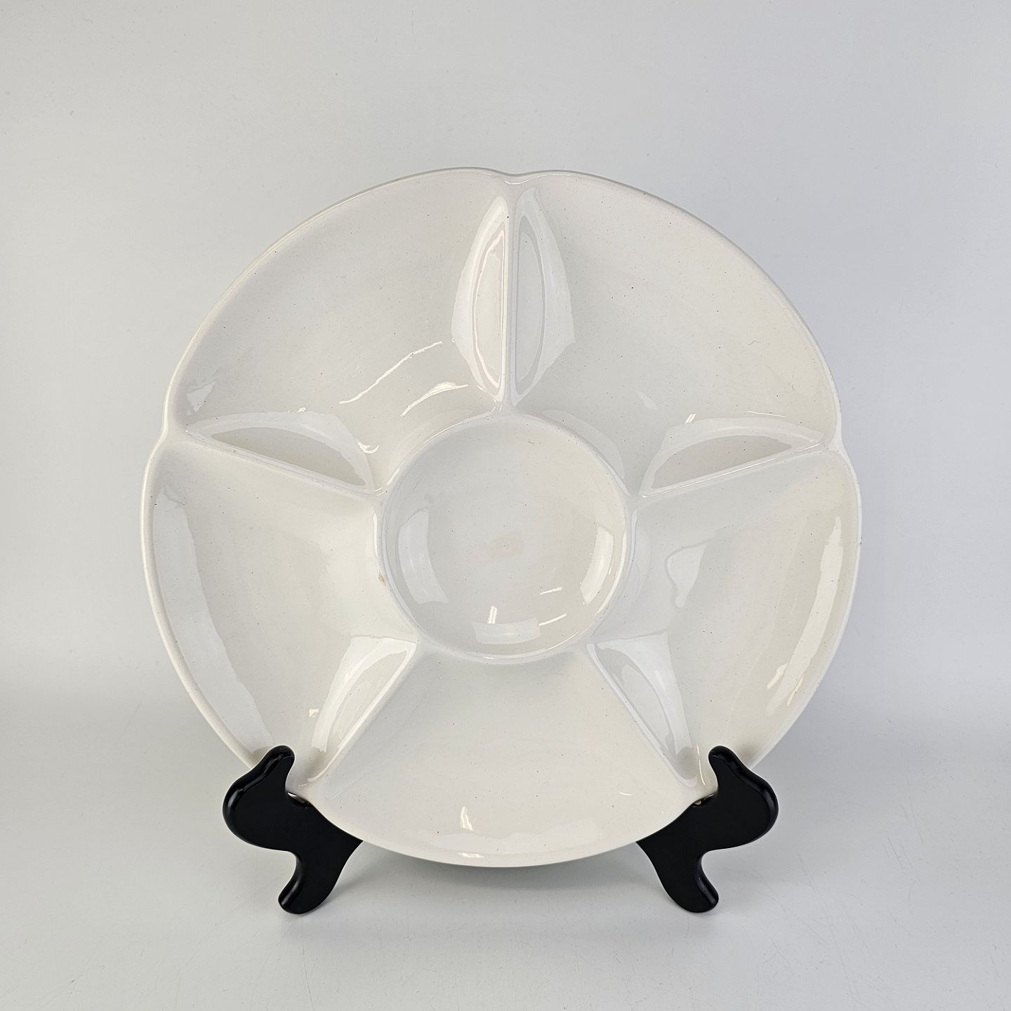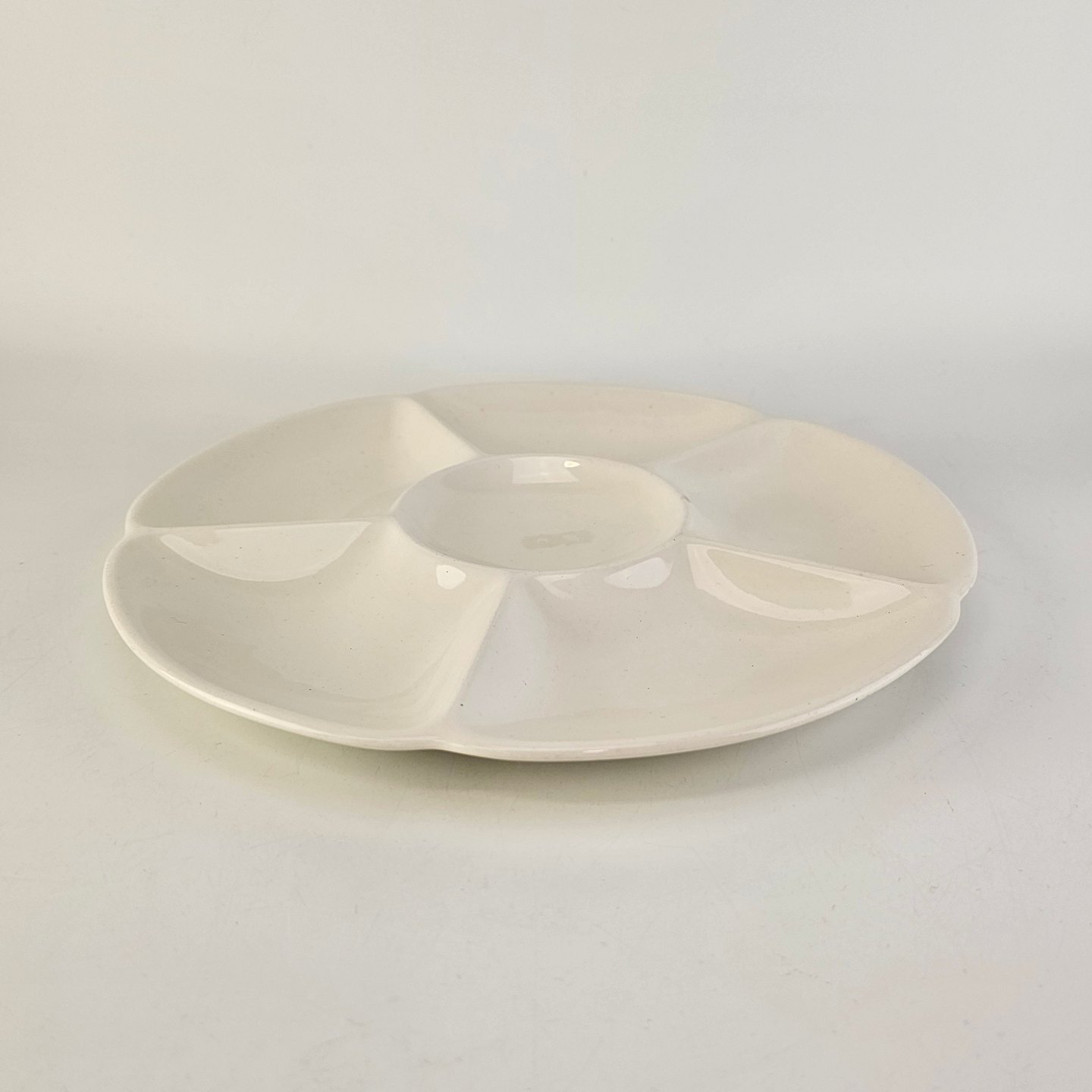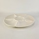 Rundt fad med seks rum i cremefarvet fajance fra stellet Alma