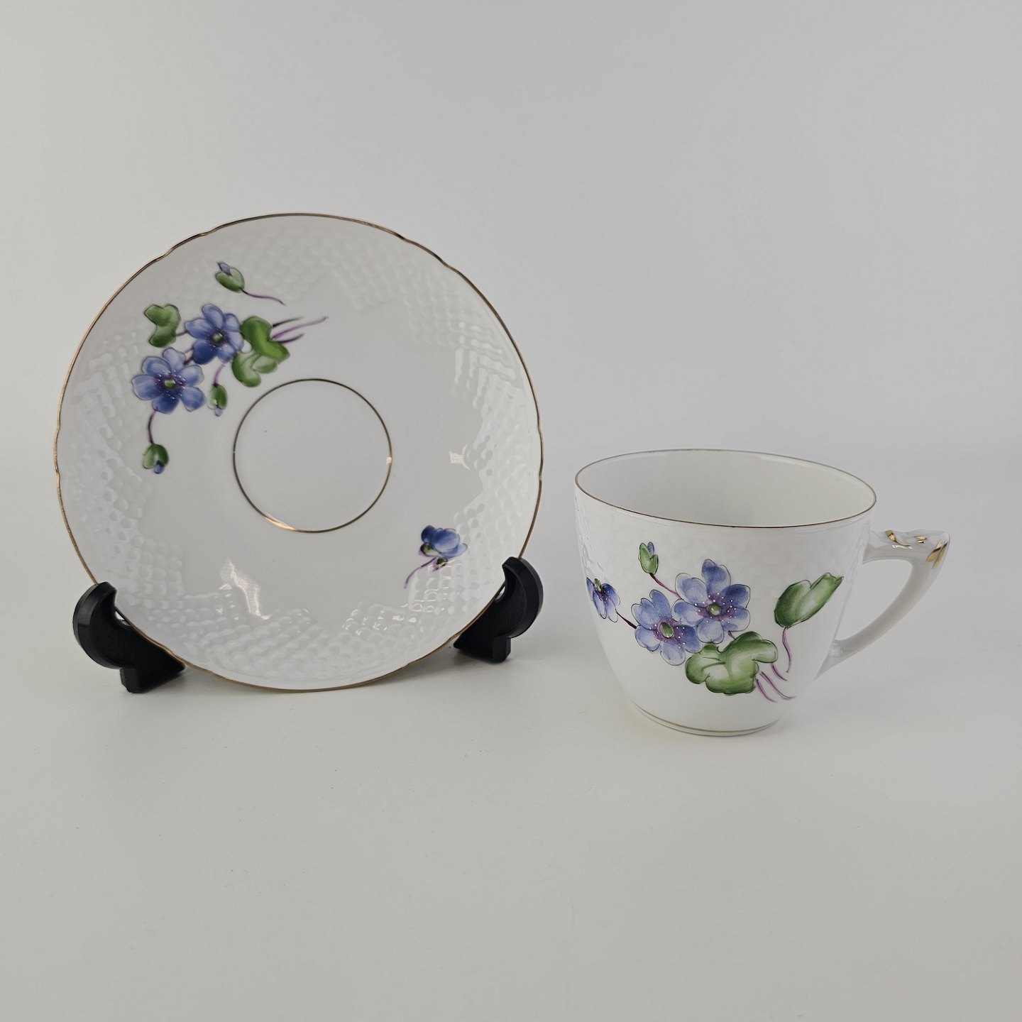 Antonius er af hvidt porcelæn med skælform dekoreret med håndmalede blå anemoner og guldkant