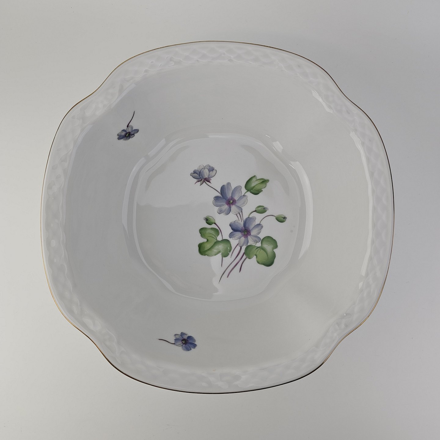 Antonius er af hvidt porcelæn med skælform dekoreret med håndmalede blå anemoner og guldkant. Også kendt under navnet Blå Anemone.