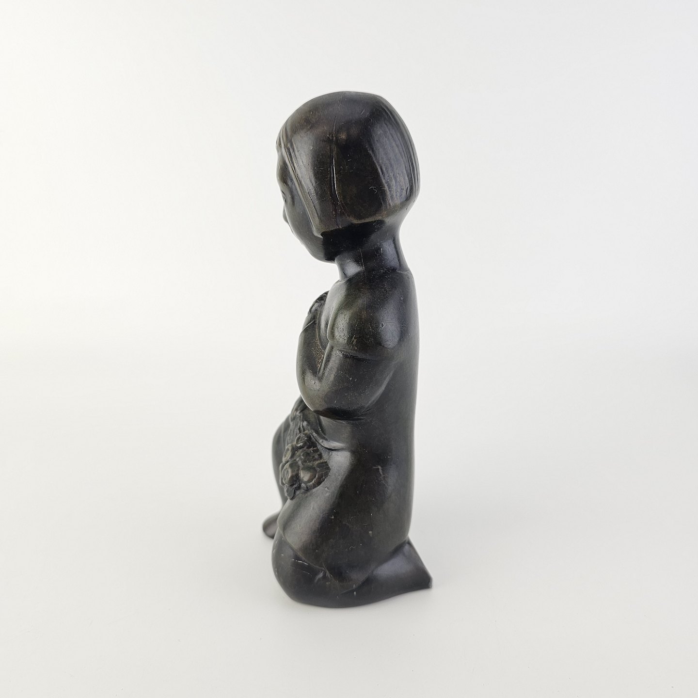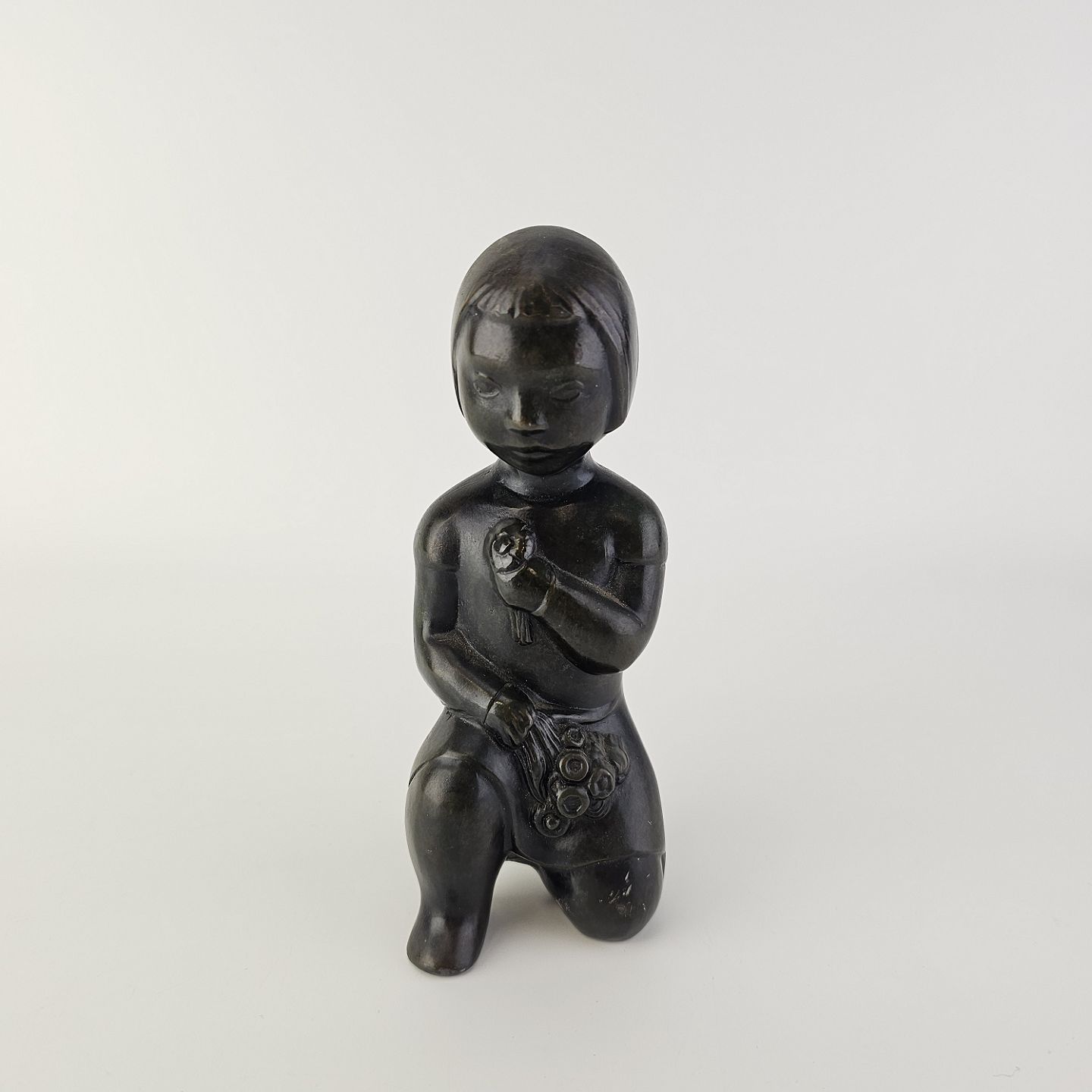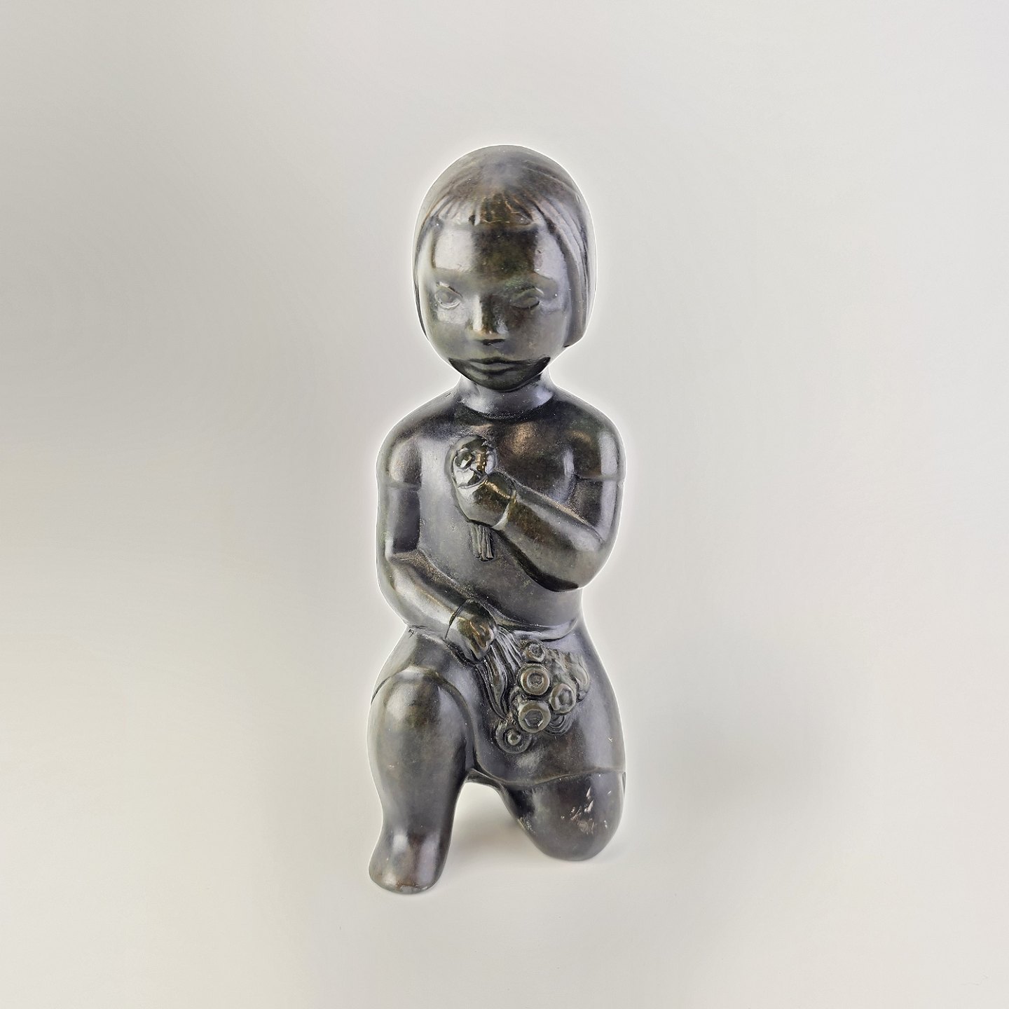 Grønlandsk figur med motiv af en knælende person med blomster Diskometal