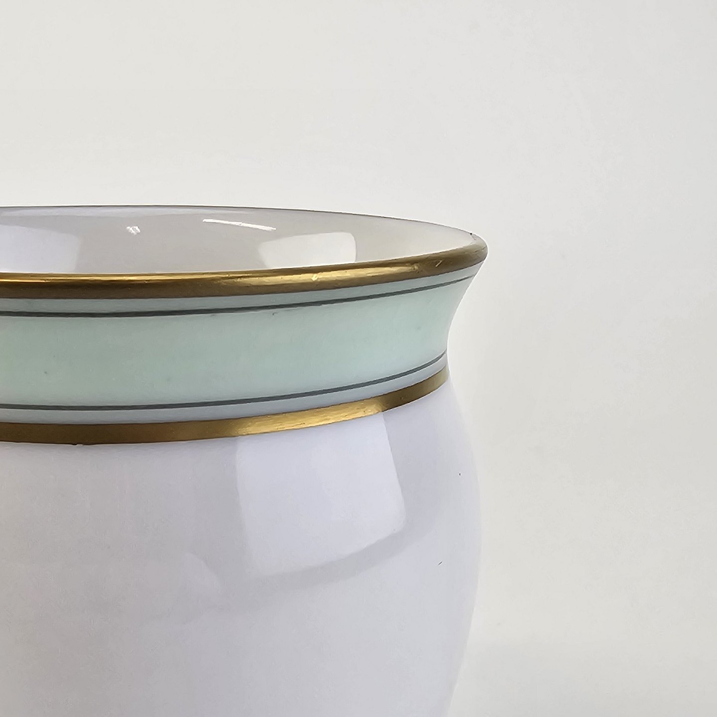 Service i glat hvidt porcelæn med mintblå dekoration og dobbelte guldkanter