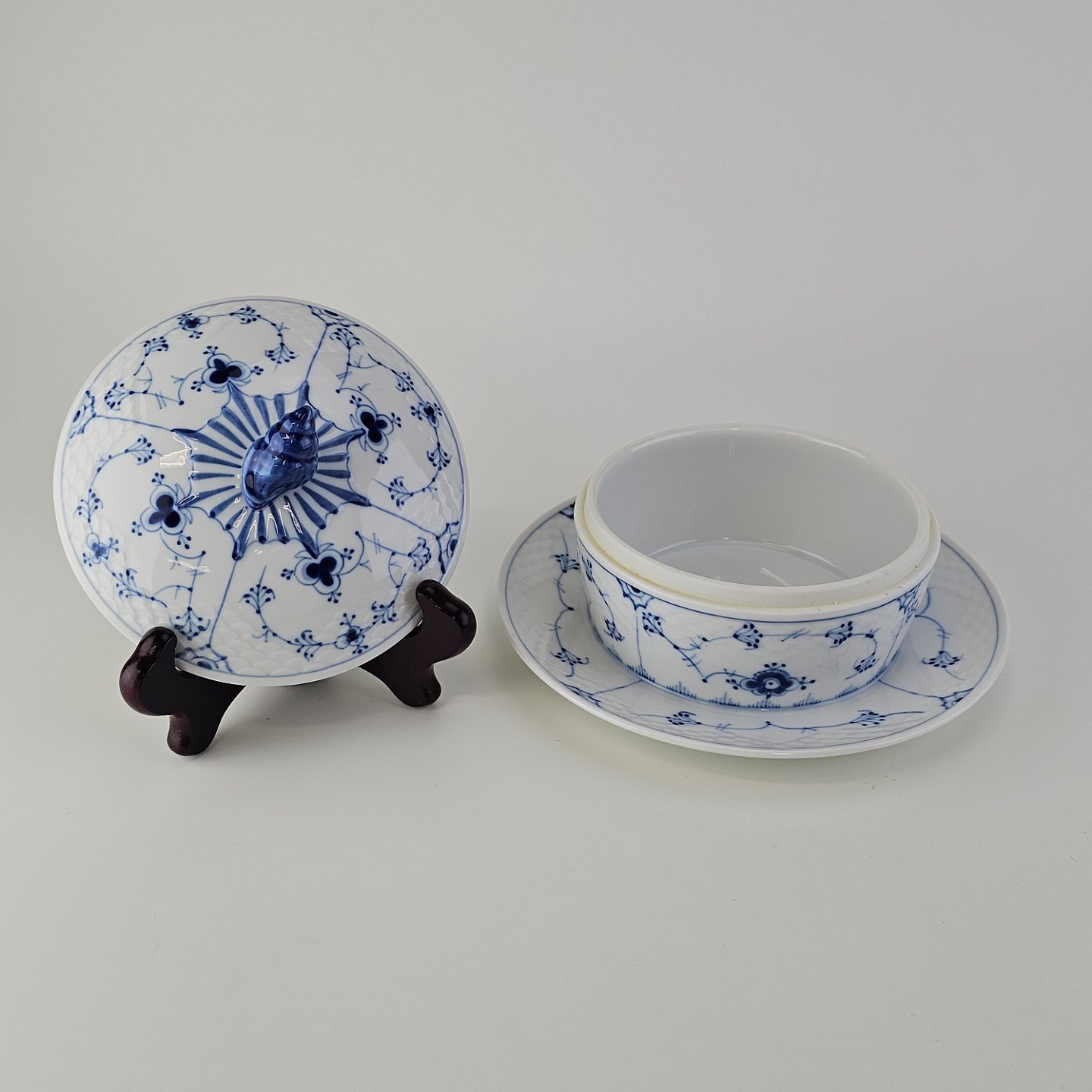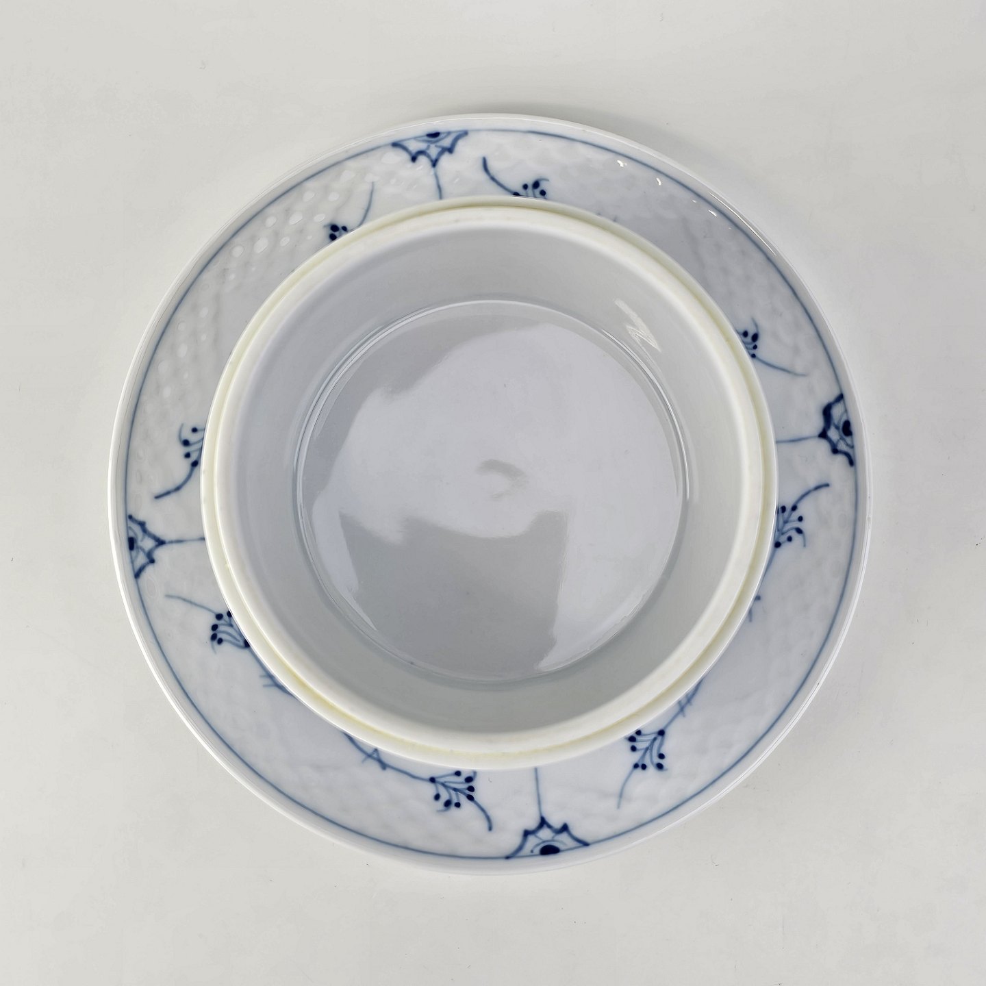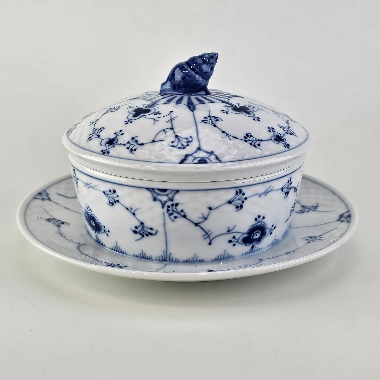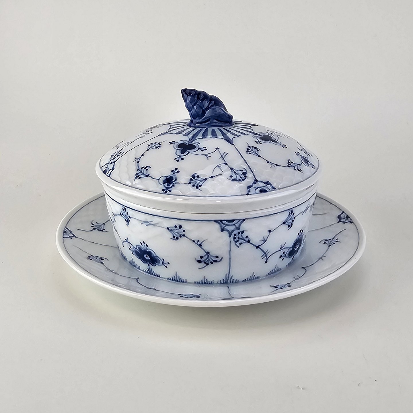 Smørkrukke på tallerken i porcelæn fra stellet Blåmalet. Nr. 196
