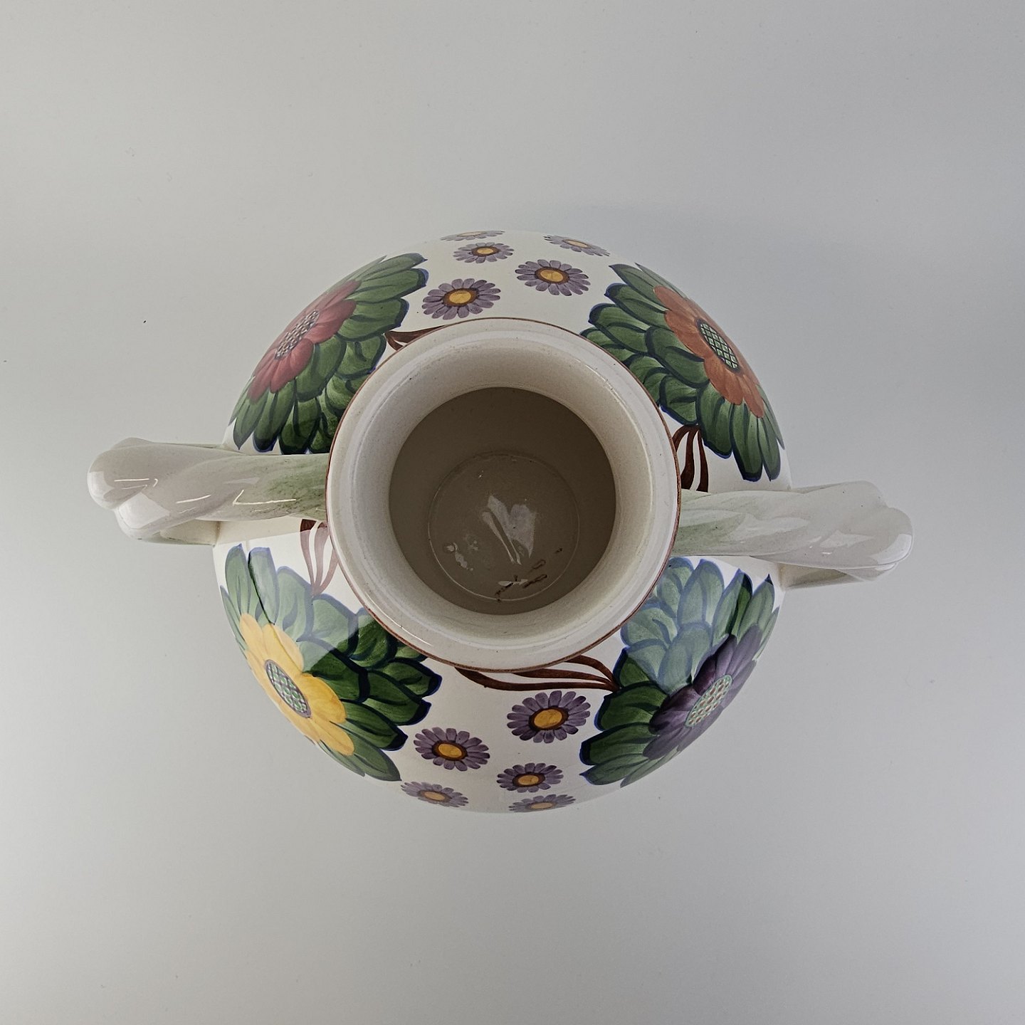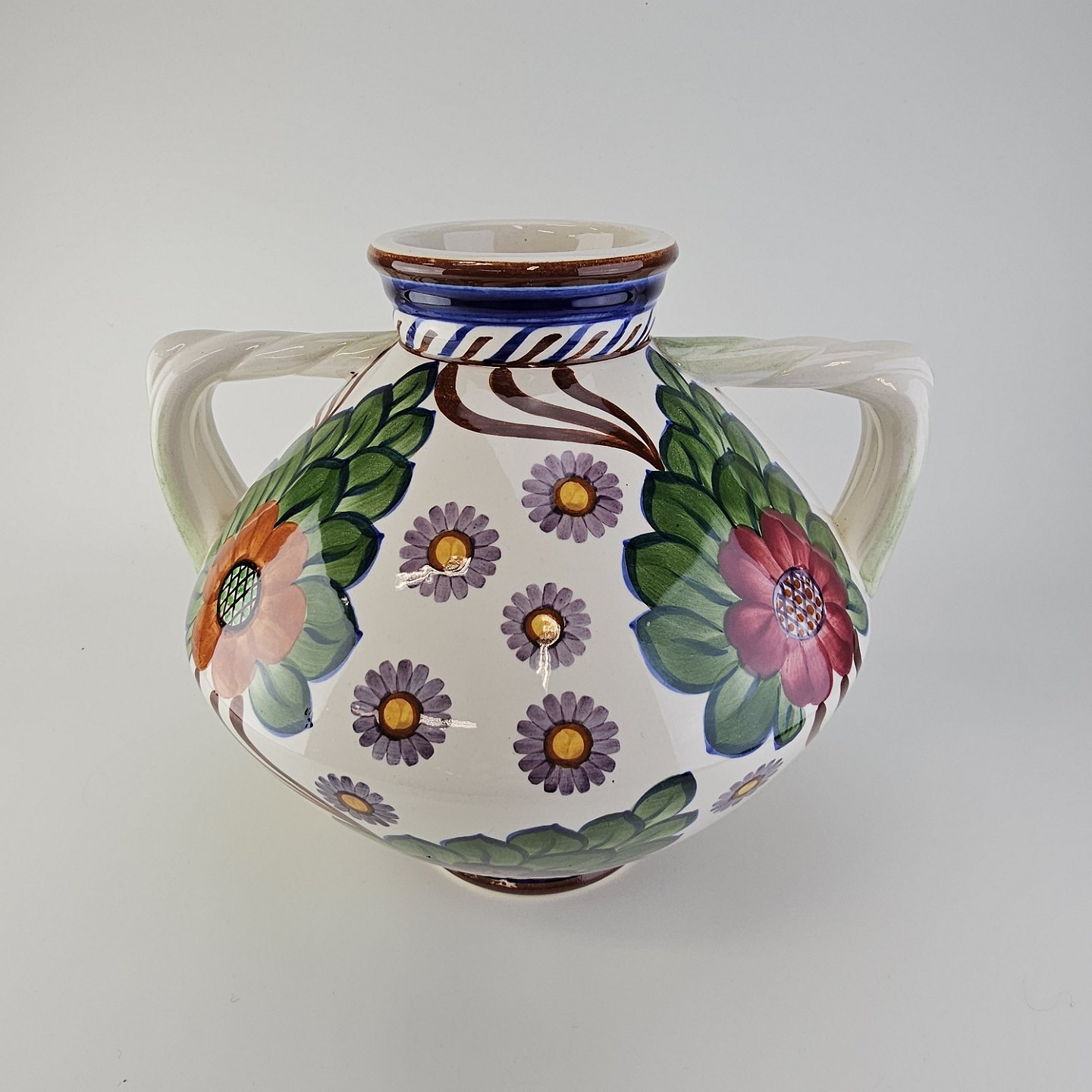 Vase med to hanke i fajance dekoreret med farverigt blomstermotiv