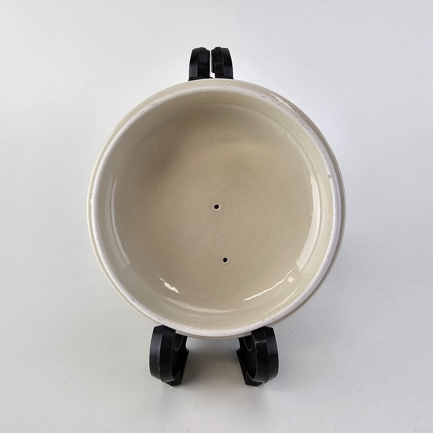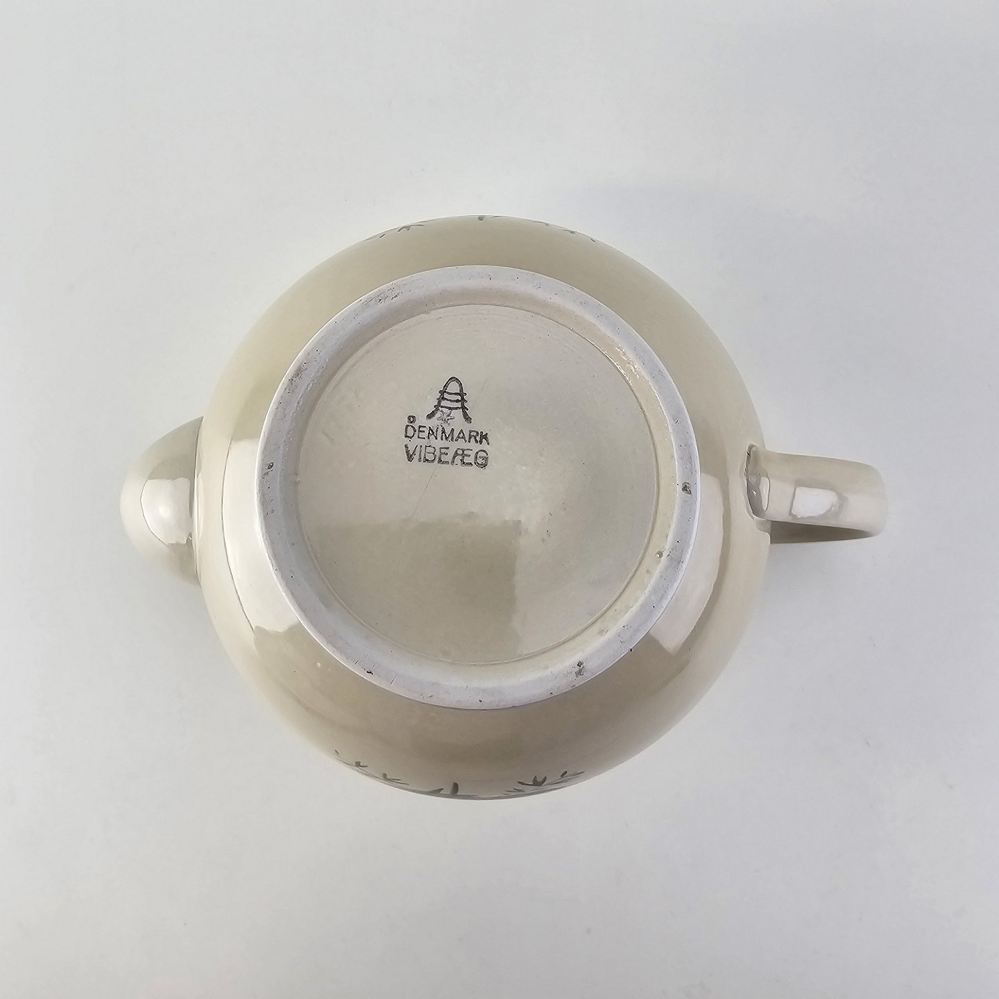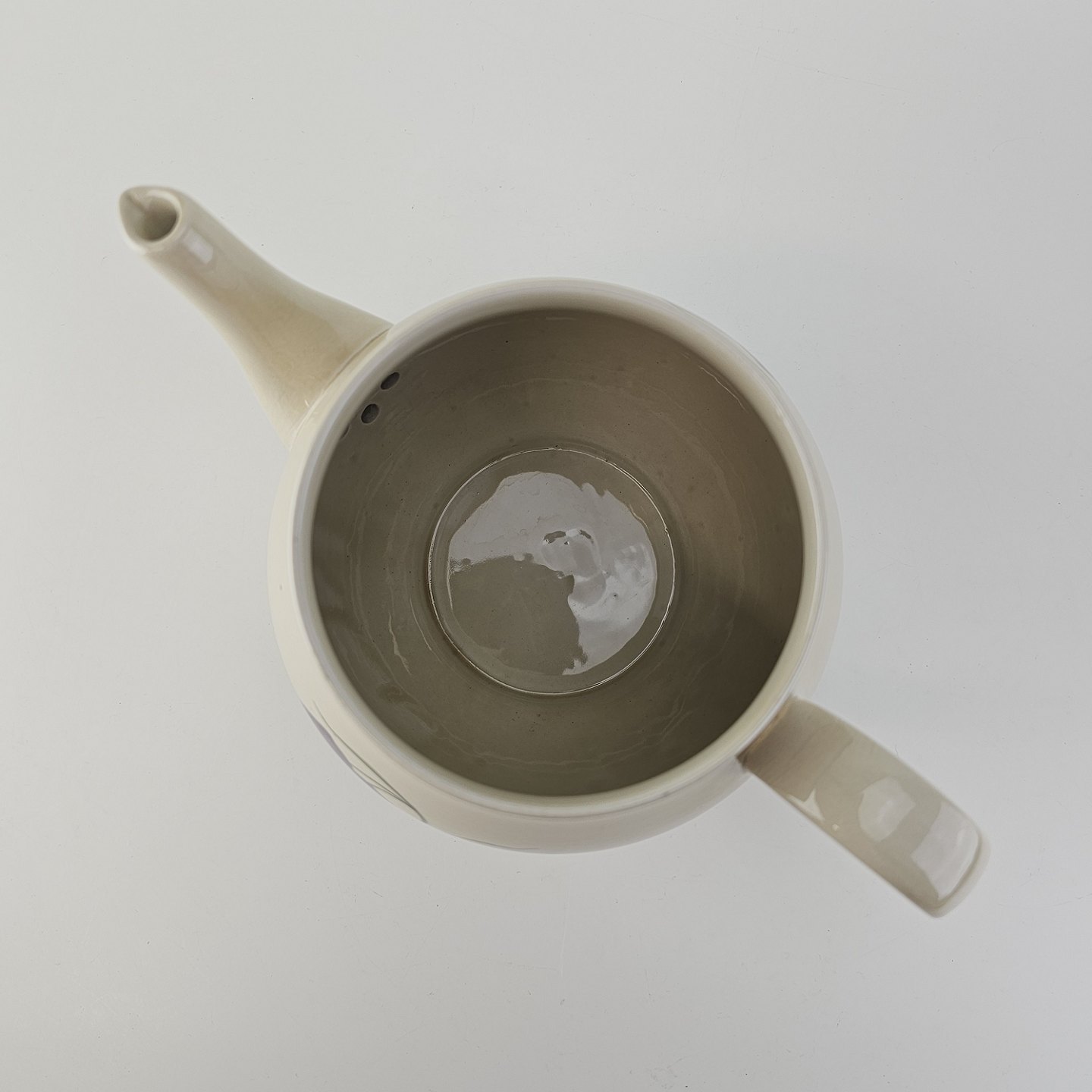 Fajancestel i stelform Viktoria II (Fletværk) med flettet kant og dekoration af en vibeæg blomst i violet og grøn, fremstillet i perioden 1934-1967