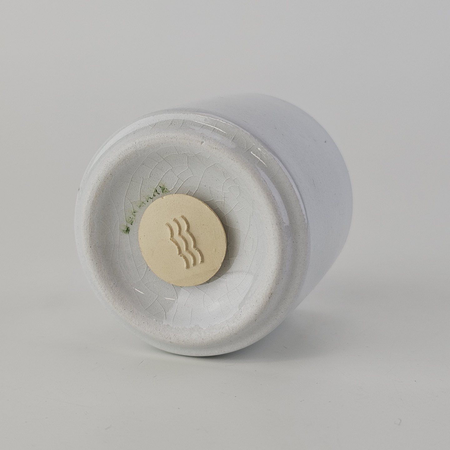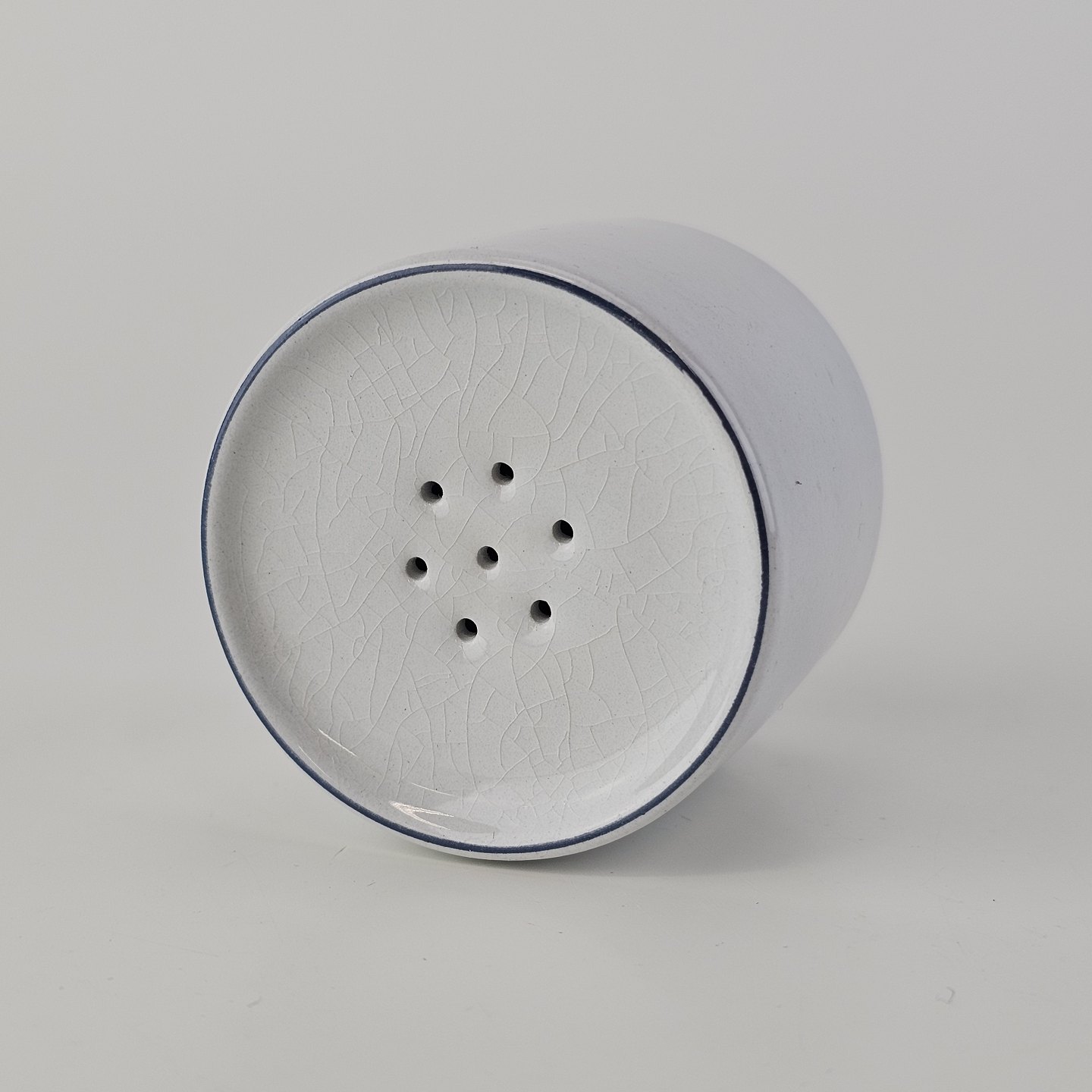 Blåkant er stel i hvid fajance med dekoration af en blå streg på kanten