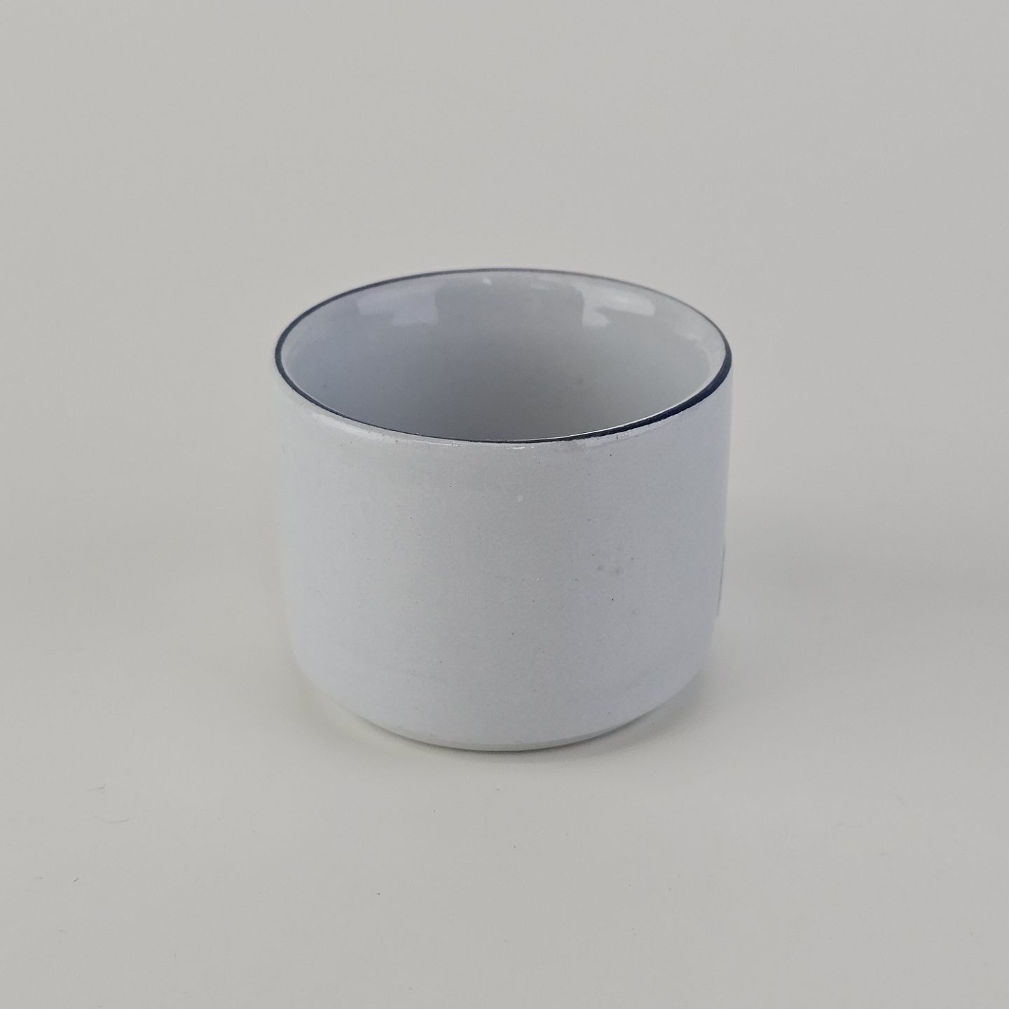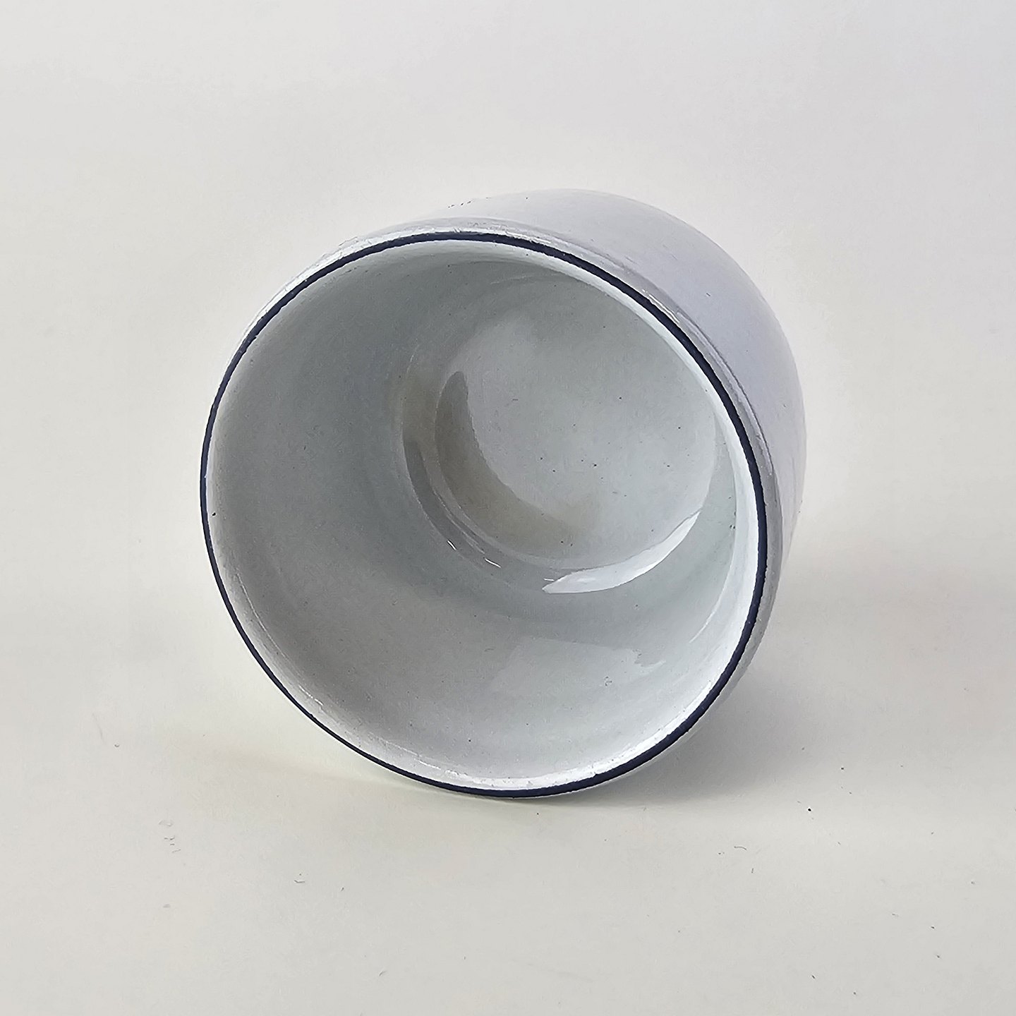 Blåkant er stel i hvid fajance med dekoration af en blå streg på kanten