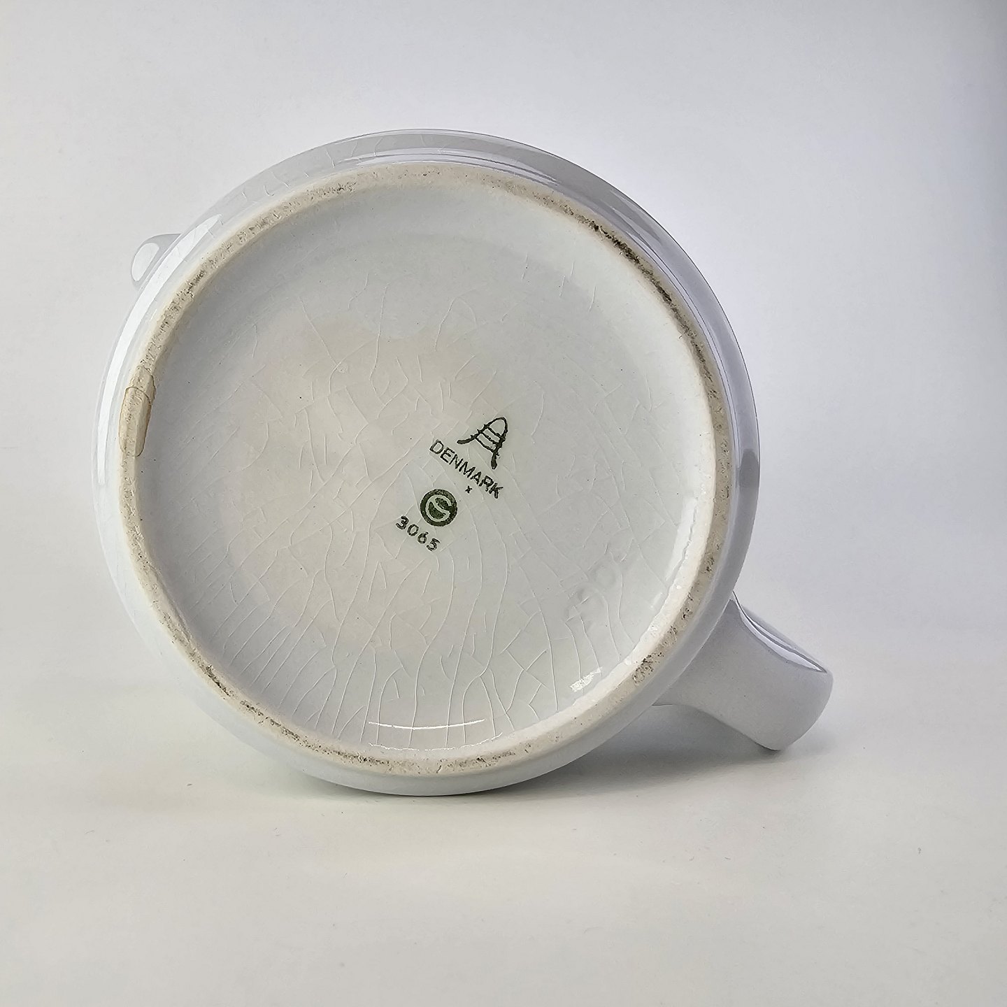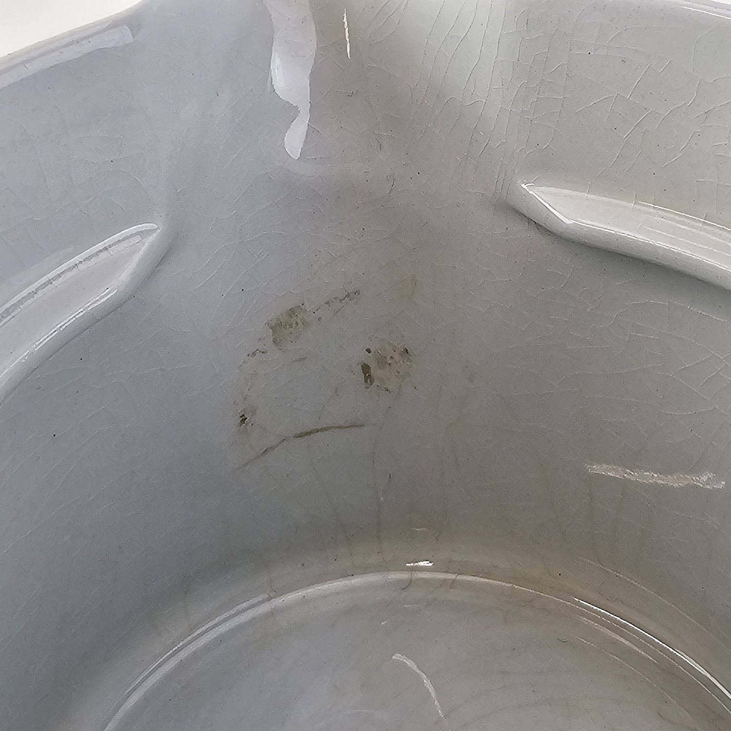 Fremstår med krakeleringer i overfladen og en mærkning på indersiden