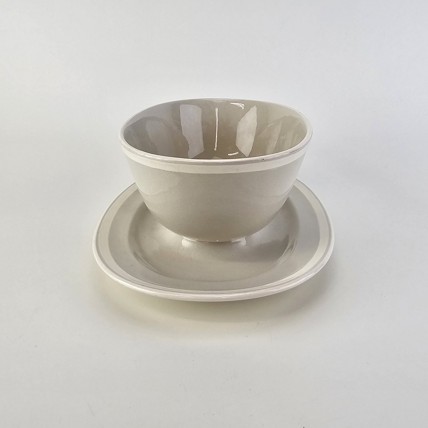 Dorrit er stel lavet på stelform D i cremefarvet fajance dekoreret med bred hvid stribe