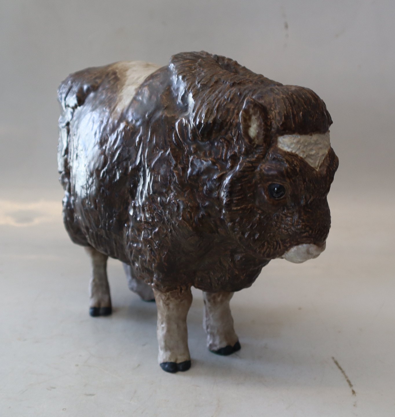 Beskrivelse: Royal Copenhagen Aluminia fajance 3149 Moskus Okse Jeanne Grut ca. 22 x 26 cm glaseret JG