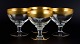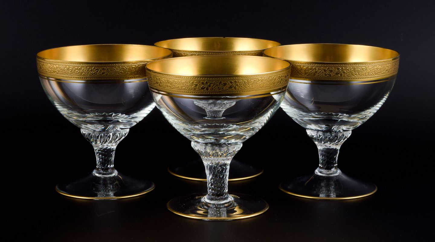 Rimpler Kristall, Zwiesel, Germany, four mouth-blown crystal champagne glasses with gold rim decorated with grapes and vine leaves.