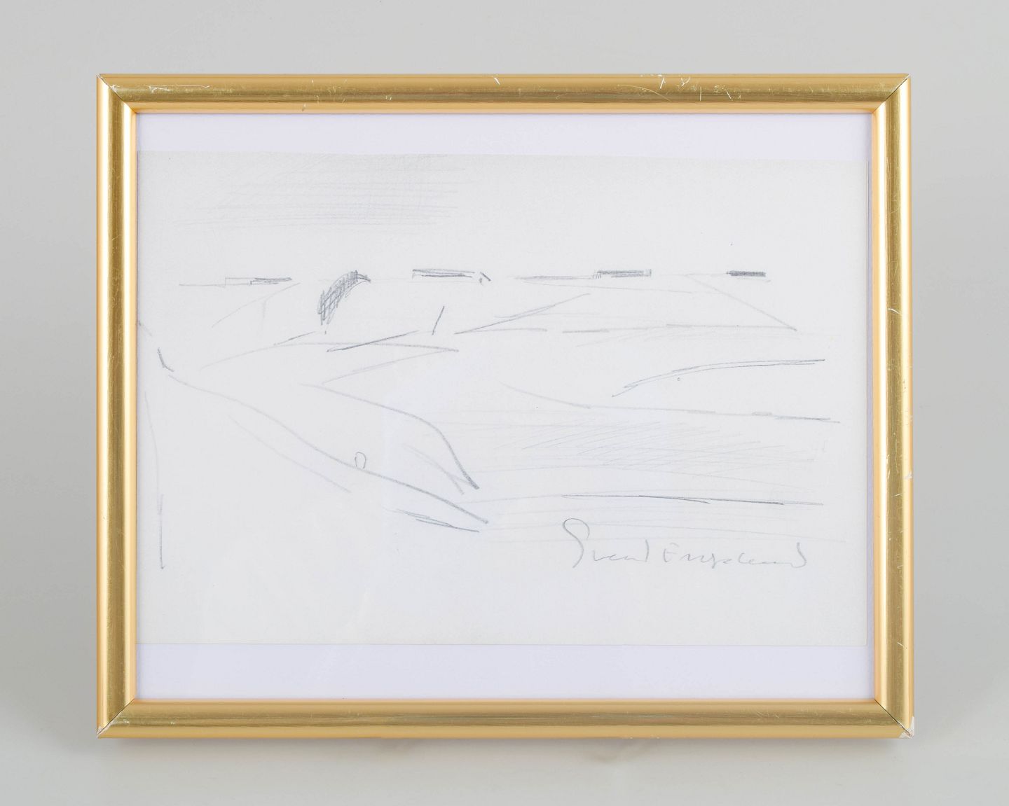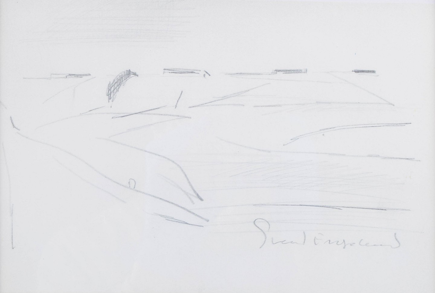 Danish landscape motif executed as a pencil drawing with a lightly abstracted composition and calm, horizontal lines.
