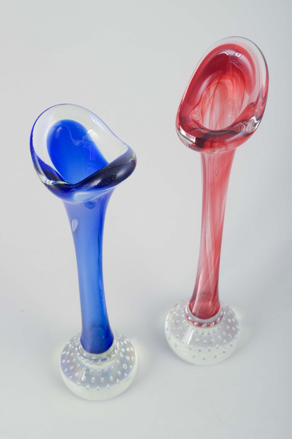 Et sæt dekorative glasvaser, én i blå og én i rød glasmasse, med højt slankt korpus og foldet åbning. Basen udført i klart glas med indfangede bobler (controlled bubbles). Fremstillet i Sverige, 1960–70’erne.