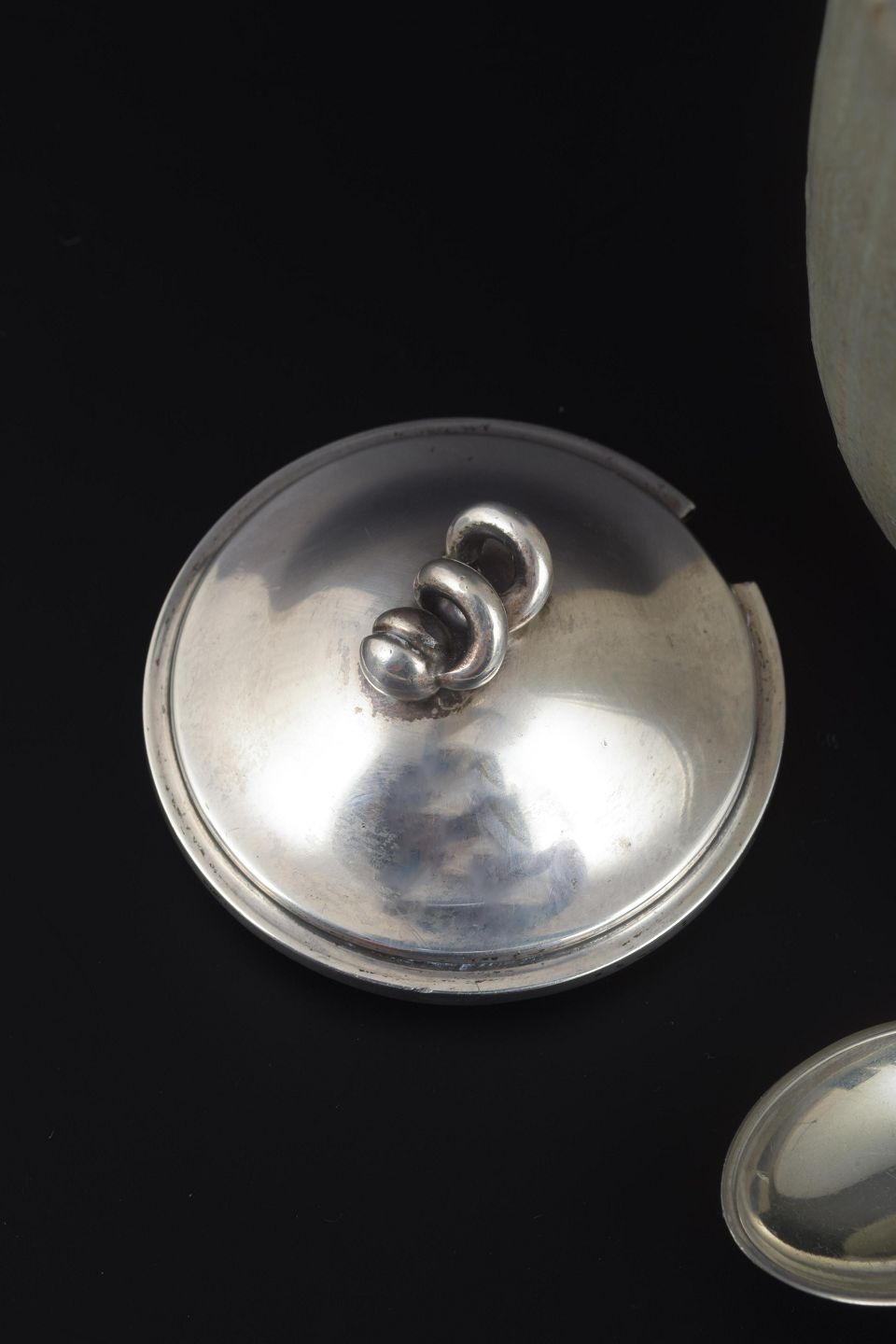 Cylindrisk riflet stentøjskrukke i grålig glasur, tilhørende låg i sølv stemplet C. Holm 830S, samt ske i sterling sølv stemplet Hans Hansen, Denmark Sterling.