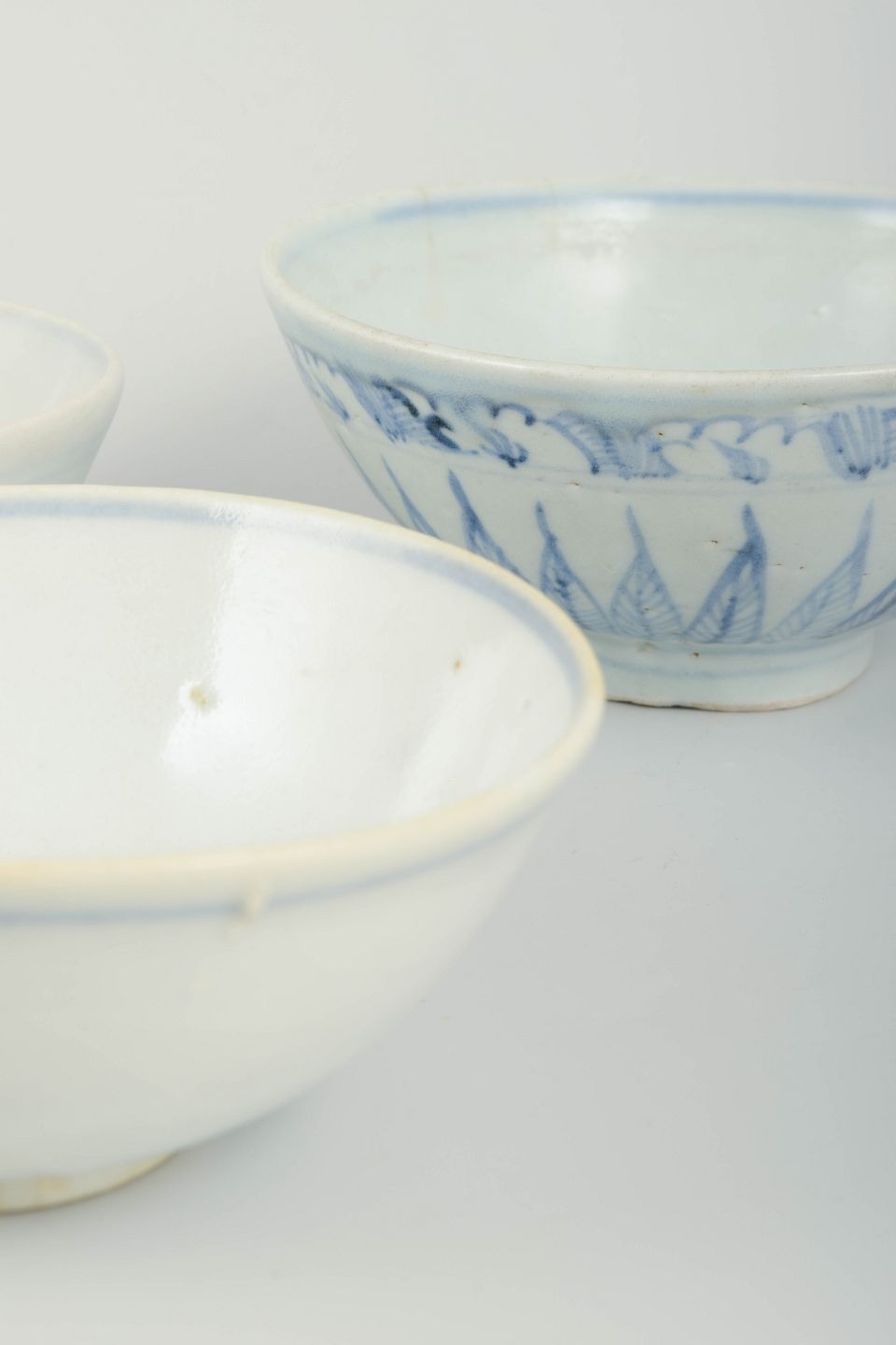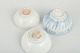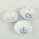 Tre drejede porcelænsskåle med underglasur dekoration i blå toner. To dekoreret indvendigt med blomster- og bladmotiver, den tredje med enkle koncentriske cirkler.