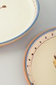 Drejet og hånddekoreret fajance med motiv af folkedansende par og musikanter i blå, brune og sorte nuancer på cremefarvet bund. Dekoreret med blå og brun kantlinje.