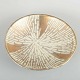 Drejet stentøjsskål med organisk form. Indvendigt dekoreret med stråleformet mønster i hvide og gyldne glasurtoner på lys brun bund. Udvendigt mørk, næsten sort glasur.