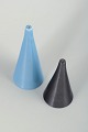 Par af kegleformede salt- og peberbøsser i glaseret fajance, i blå og sort glasur.