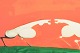 To stiliserede fugle i hvid silhuet, placeret mod en stærk orange baggrund og grøn forgrund. Den enkle, men kraftfulde farvekontrast skaber en dynamisk og poetisk stemning. Værket er nummereret 170/200 og signeret samt dateret 1969.