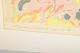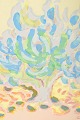 Et poetisk og farverigt farvelitografi med organiske og abstrakte former i blå, grønne, rosa og gule nuancer. Værket har en let og drømmende karakter, hvor penselstrøgene danner rytmiske mønstre og antyder et landskab i bevægelse.