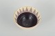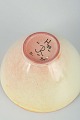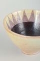 Organisk formet skål i drejet stentøj med lys ydre glasur i rosa/hvide toner og indvendigt dekoreret med mørk glasur samt trekantmønster i brune nuancer.
