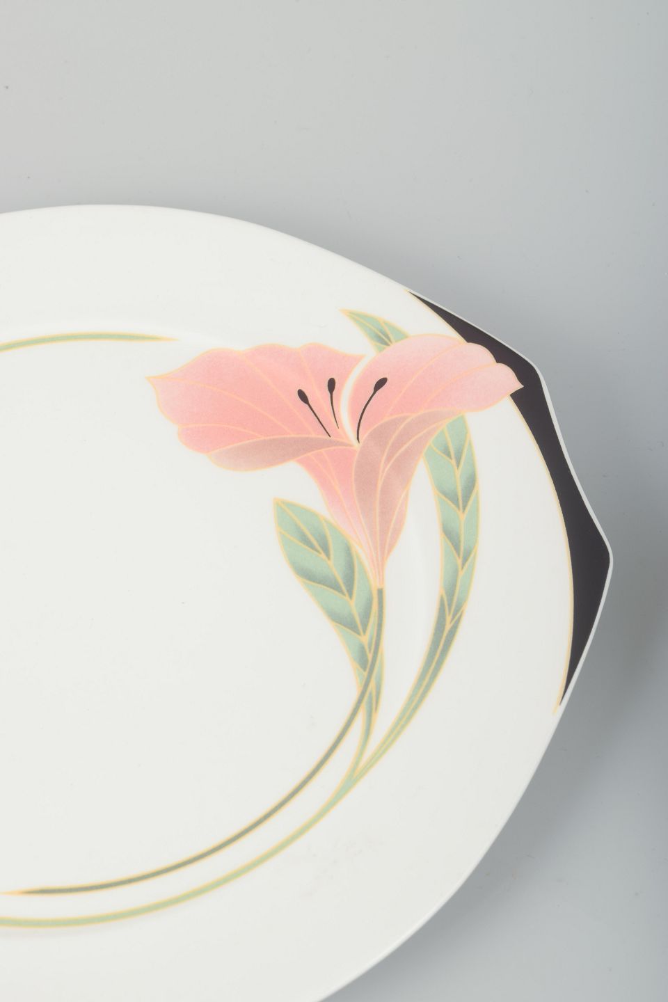 To porcelænstallerkener med håndmalet blomsterdekoration i rosa, grønne og sorte nuancer. Serien kombinerer bløde linjer med et elegant postmodernistisk udtryk.