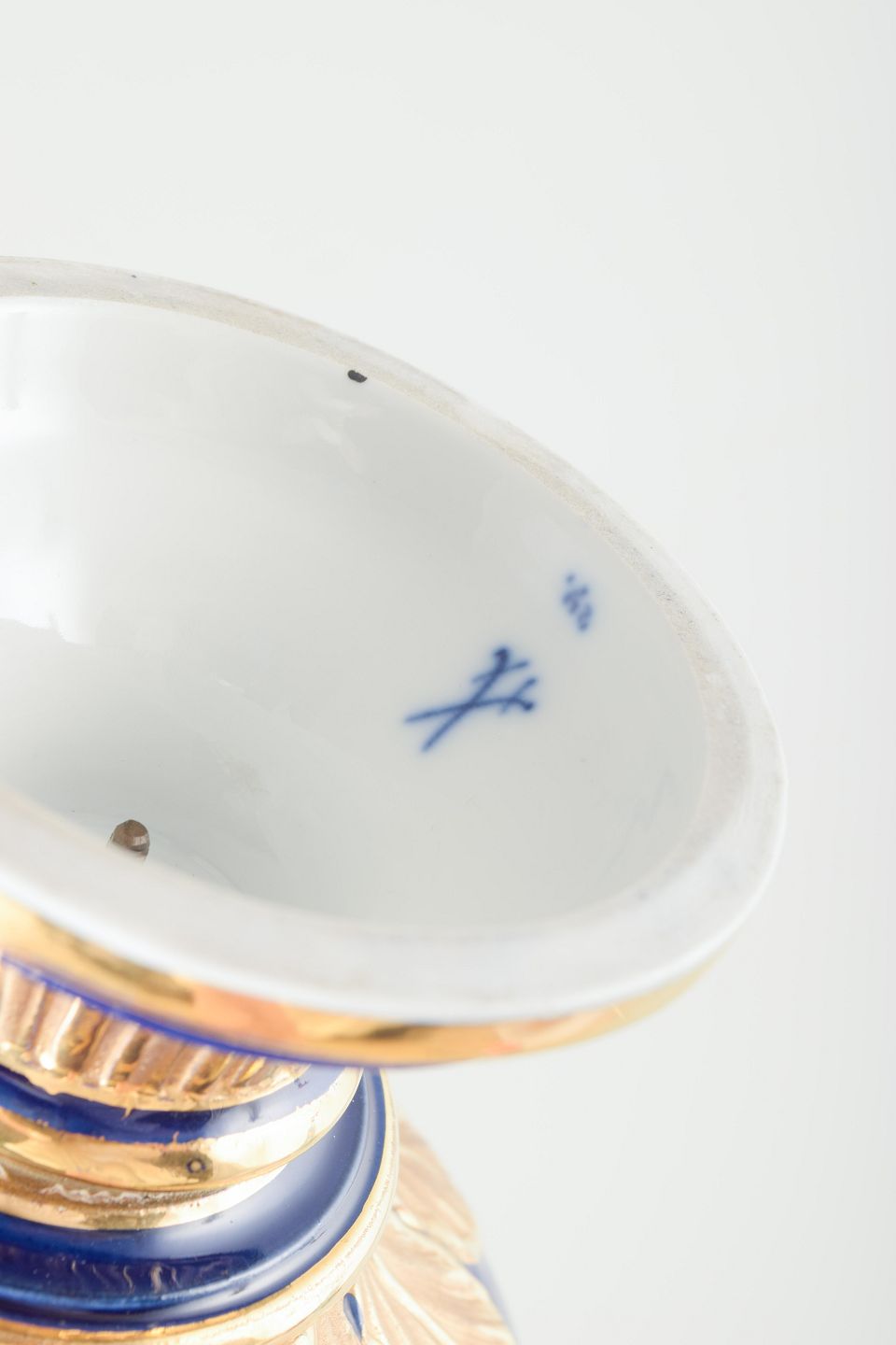 Elegant porcelænsvase med låg i dyb koboltblå glasur, rigt dekoreret med forgyldte akantus- og båndmotiver. Klassisk form med profileret fod og svungen hals, udført i Meissens karakteristiske kvalitet.