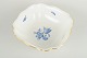 Hånddekoreret porcelæn med håndmalede blå blomsterdekorationer og forgyldt staffering langs den bølgende kant. Let asymmetrisk og organisk form.