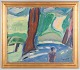 Et stemningsfuldt modernistisk landskab fra Søndermarken gengivet i Hoppe’s karakteristiske koloristiske stil med brede, pastose penselstrøg og forenklede, organiske former. Den figurative opbygning balancerer mellem det naturalistiske og det abstrakte — med den menneskelige figur diskret integreret i et poetisk blågrønt rum.