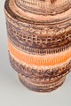 Cylindrisk stentøjsvase med karakteristiske indgraverede bånd og varm orange-brun glasur i relief.