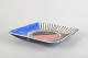 Rektangulær skål i stentøj med hånddekoreret konkret/geometrisk motiv i blå, sort, rød og hvid glasur. Let svungne kanter og lav kuvet form.