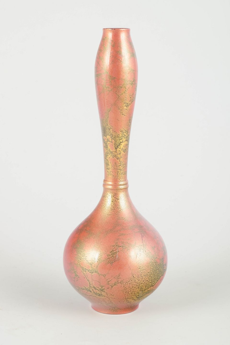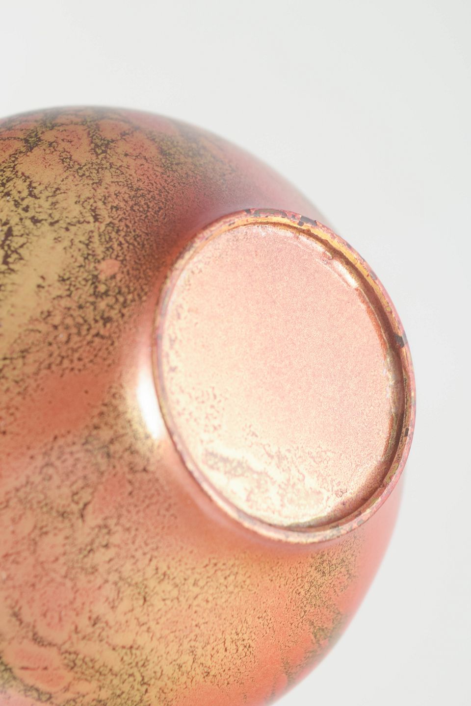 Elegant slankformet metalvase med håndpåført japansk murachido-emaljeglasur i varme rosé- og guldtone nuancer med iriserende spil og organisk dekormarmorering.